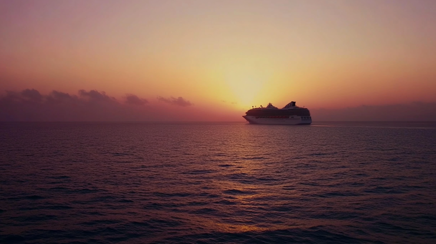 Cruise ship sailing at sunset with vibrant orange and pink sky, calm ocean waves, and serene atmosphere.