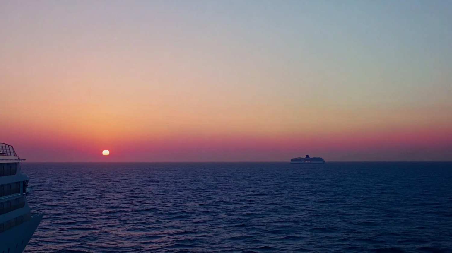 Sunset over the ocean with two cruise ships, one close and one distant, under a vibrant orange and pink sky.
