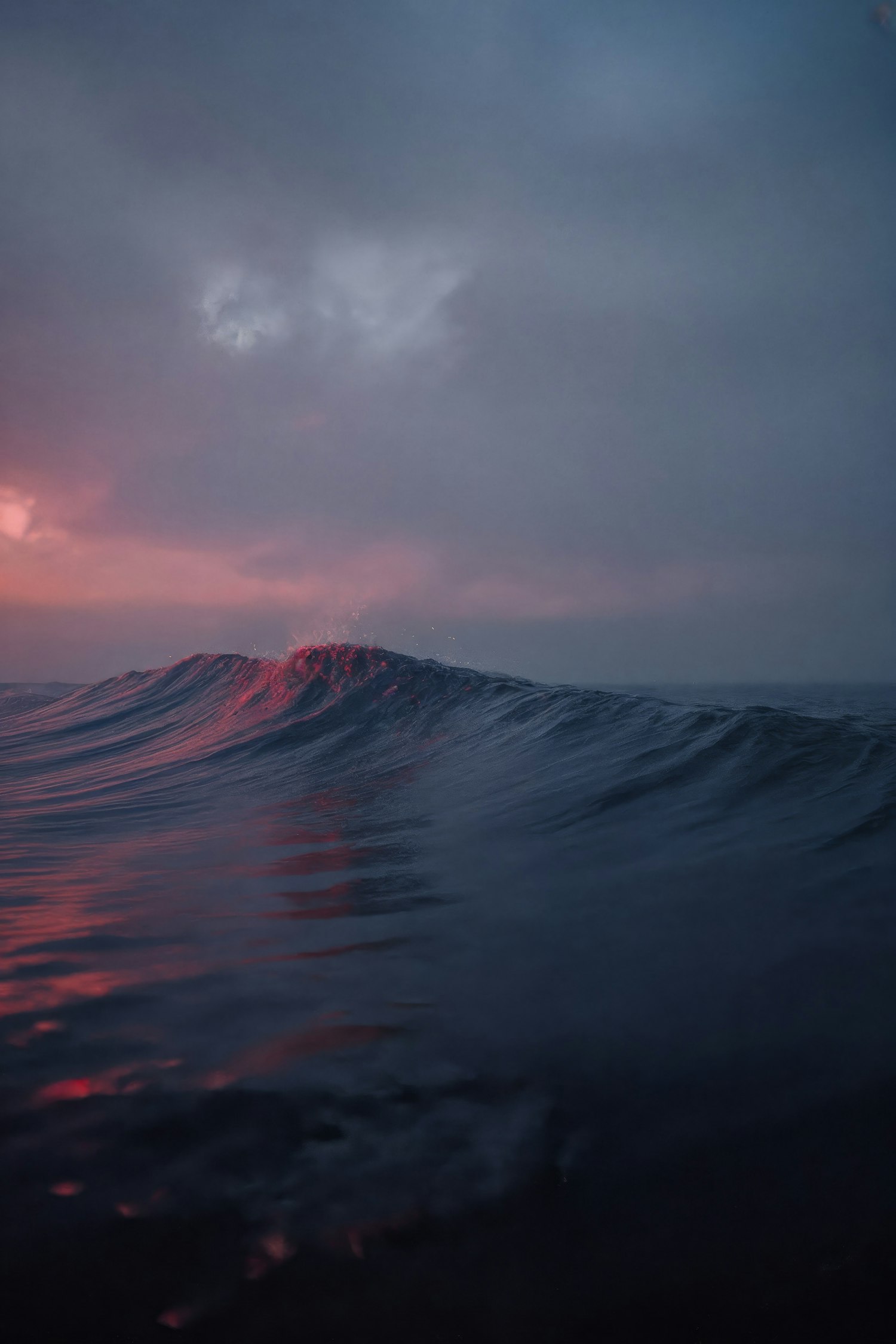 A stunning ocean wave glows with pink hues under a dramatic sky, creating a serene and captivating seascape.