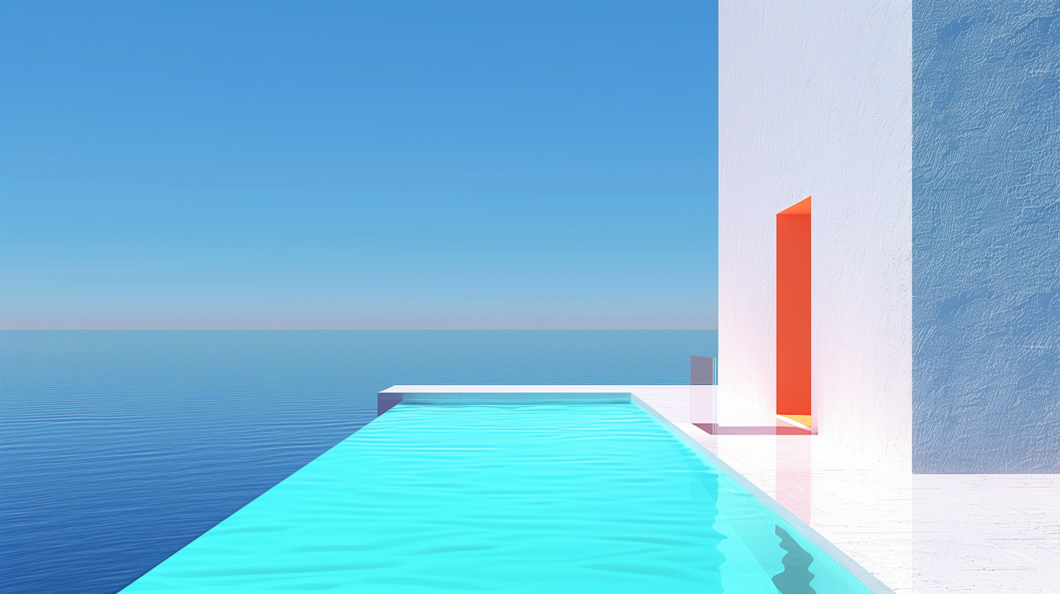 Minimalist infinity pool blending into ocean with white building and orange doorway, under a clear blue sky.