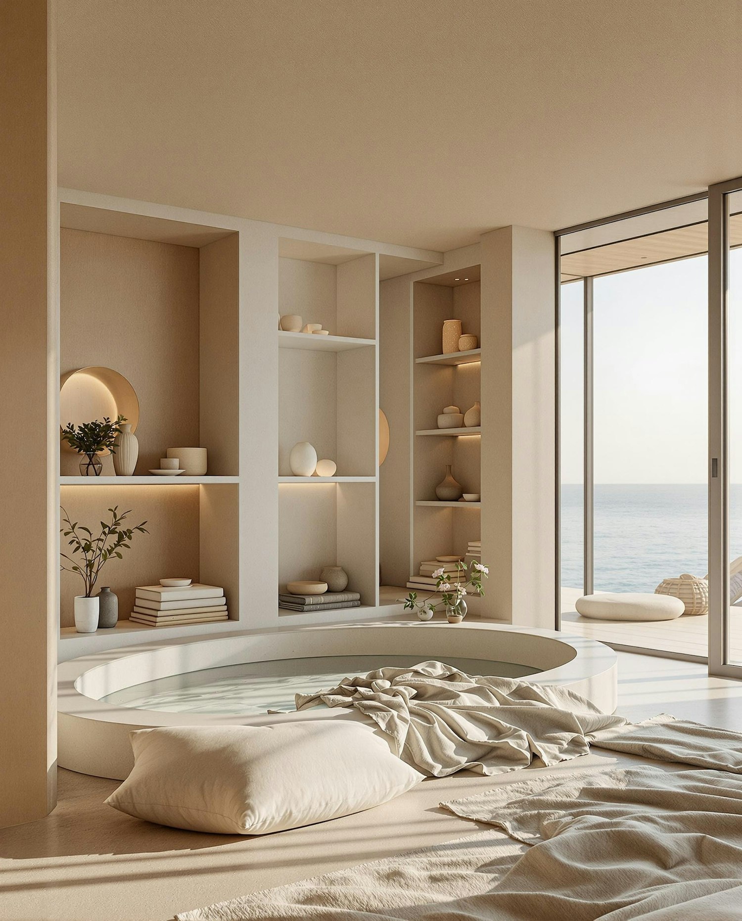 Minimalist interior with a sunken bathtub, neutral decor, and ocean views through glass doors. Perfect for relaxation and tranquility.