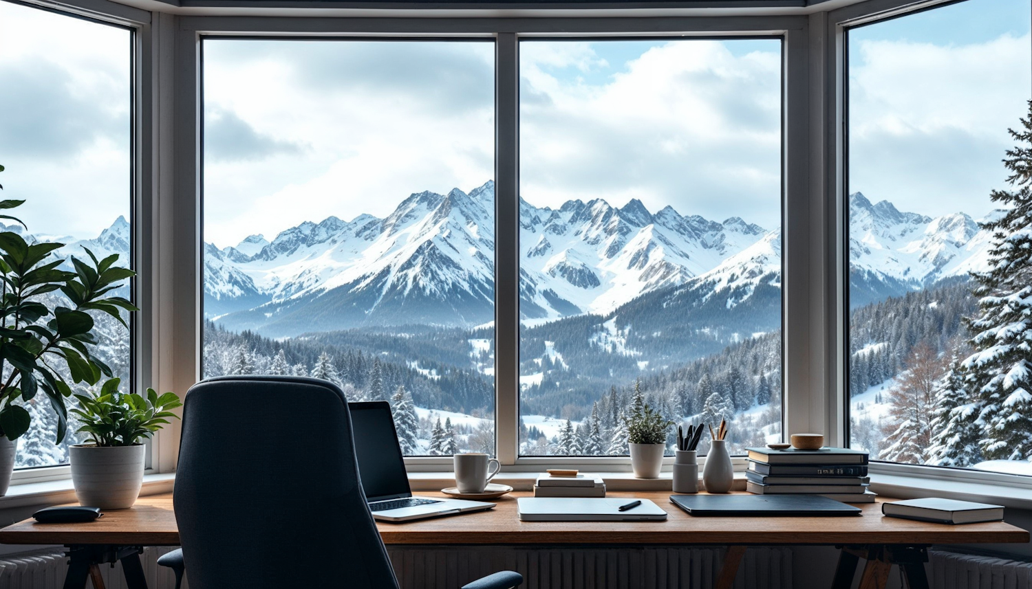 Home office with a stunning view of snow-capped mountains, featuring a wooden desk, laptop, and potted plants.
