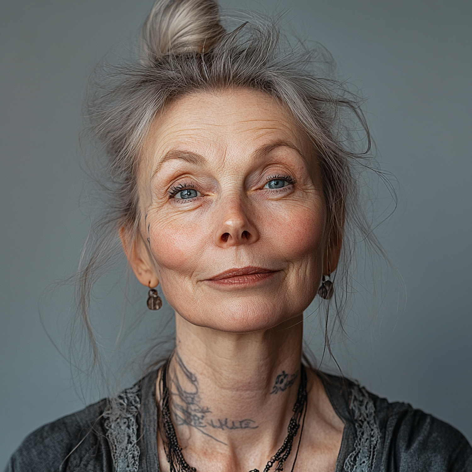 Elegant mature woman with gray hair, tattoos, and bohemian jewelry, exuding confidence and grace against a muted gray background.