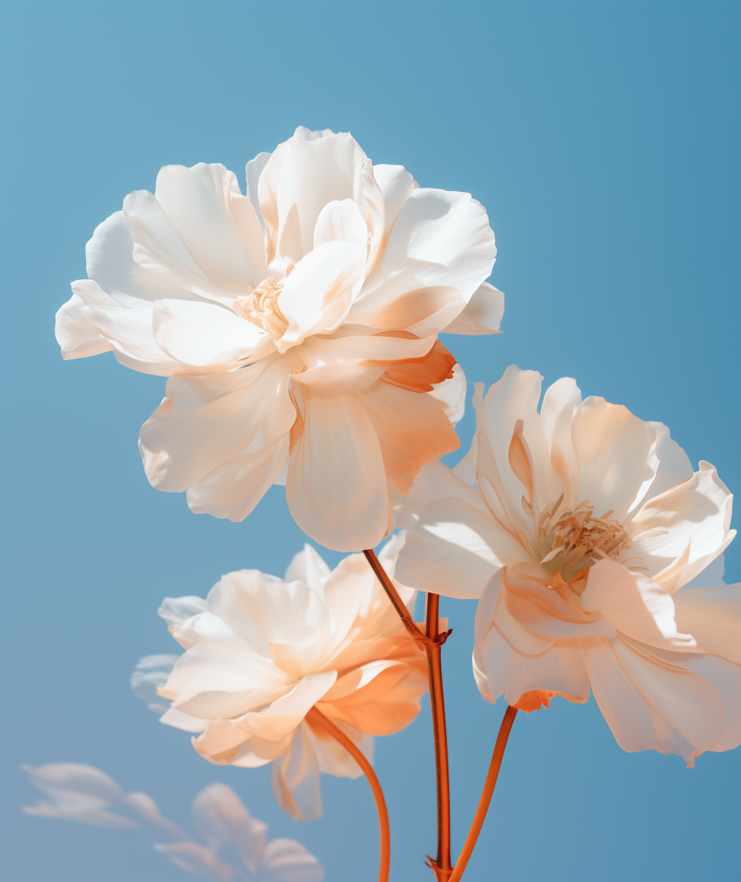 Elegant white flowers with peach hues against a clear blue sky, showcasing delicate petals and graceful stems.