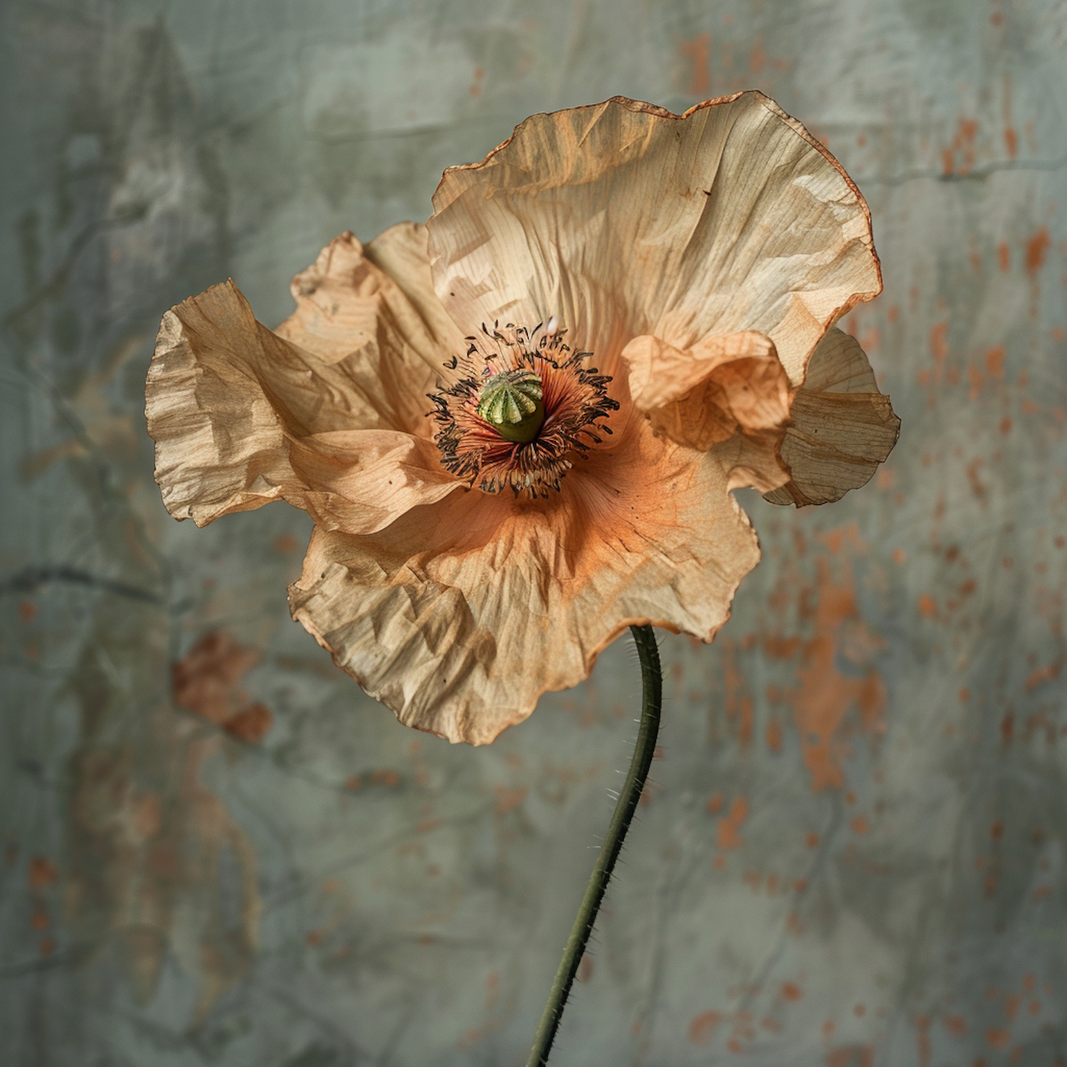 Delicate poppy flower with crinkled orange petals against a textured green background, highlighting its natural elegance.
