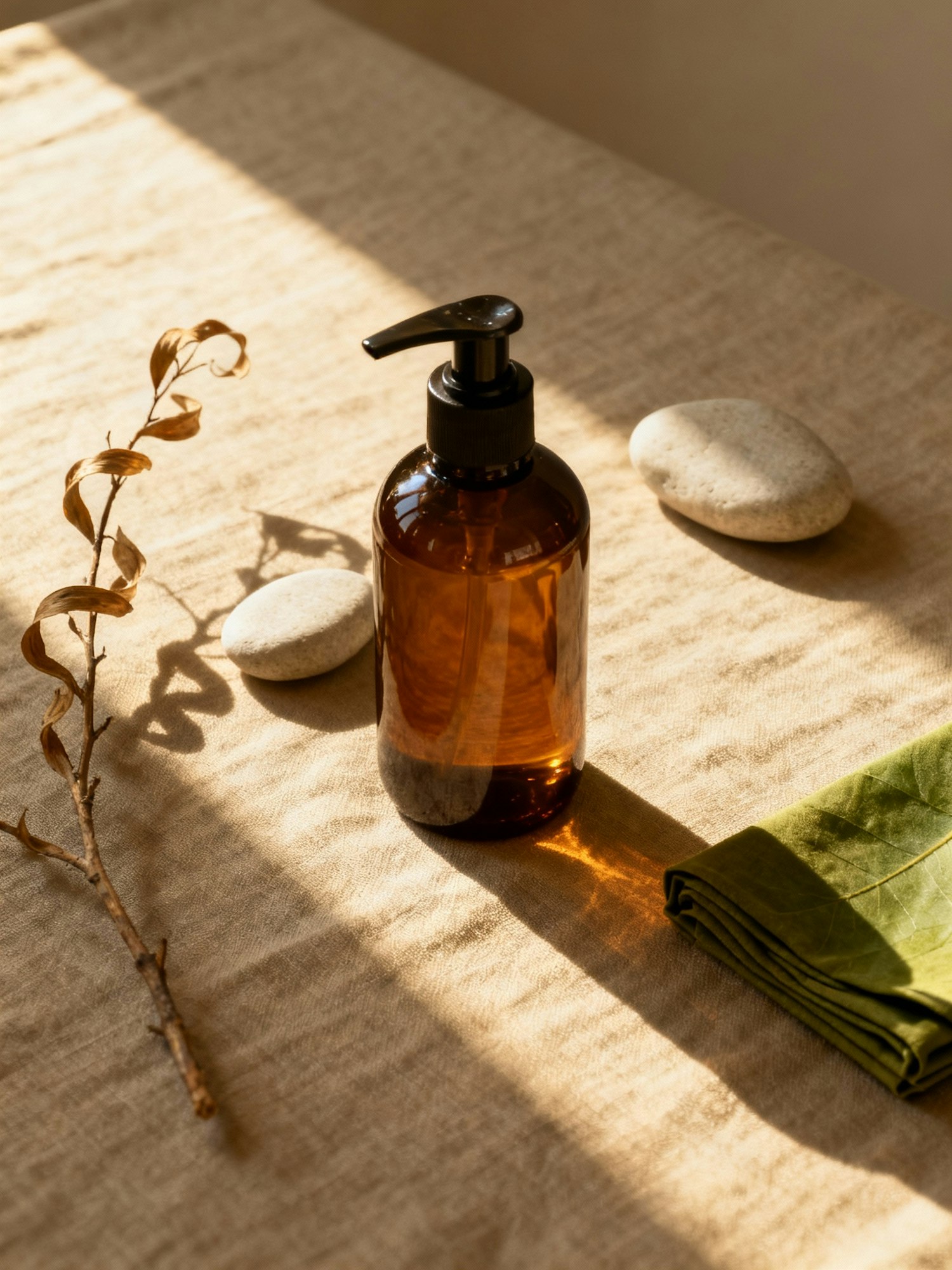 Amber pump bottle placed on a fabric-textured surface, surrounded by a dry curved branch, a folded green leaf, and a pale stone. Golden diffused daylight streams from the top left, casting warm shadows that frame the product. Subtle tonal contrast between beige and olive hues. The mood is serene, tactile, and refined, inspired by architectural naturalism.