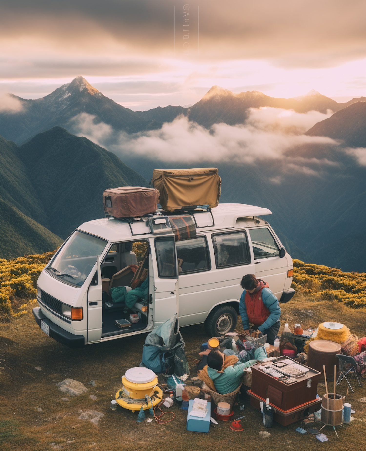 Camping setup with a white van on a mountain hilltop, surrounded by gear and stunning mountain views at sunrise or sunset.