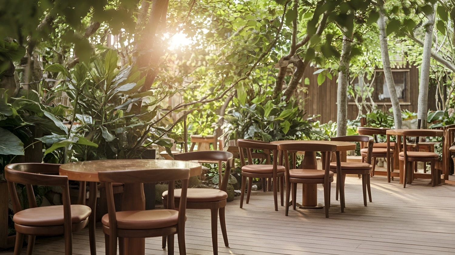 Cozy outdoor café with wooden furniture surrounded by lush greenery and warm sunlight filtering through the trees.