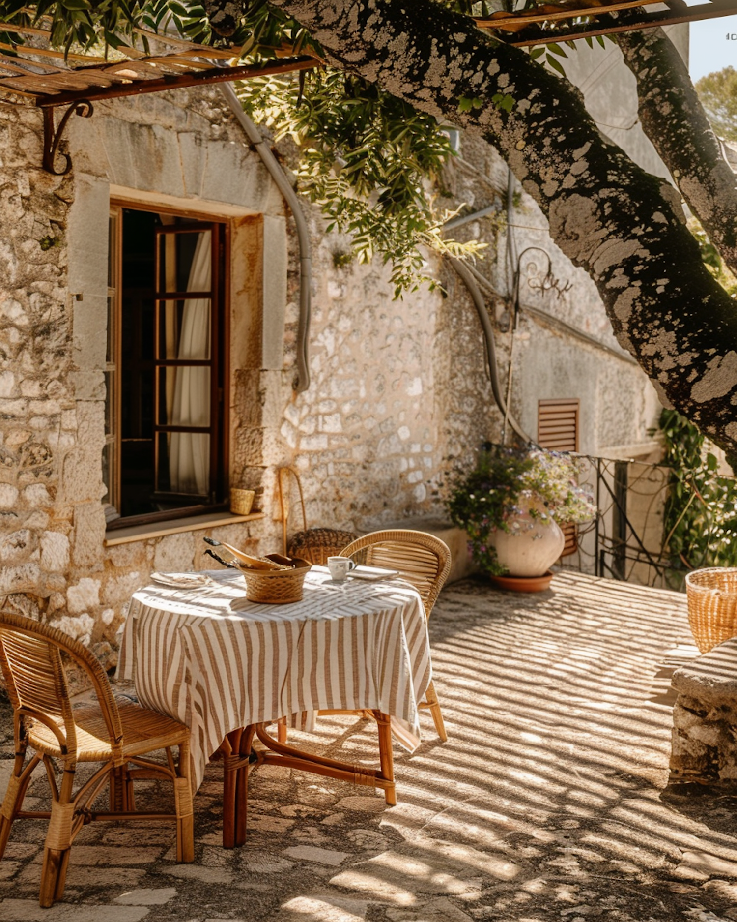 Charming patio with wicker chairs, a striped tablecloth, and dappled sunlight. Perfect for a relaxing outdoor meal.