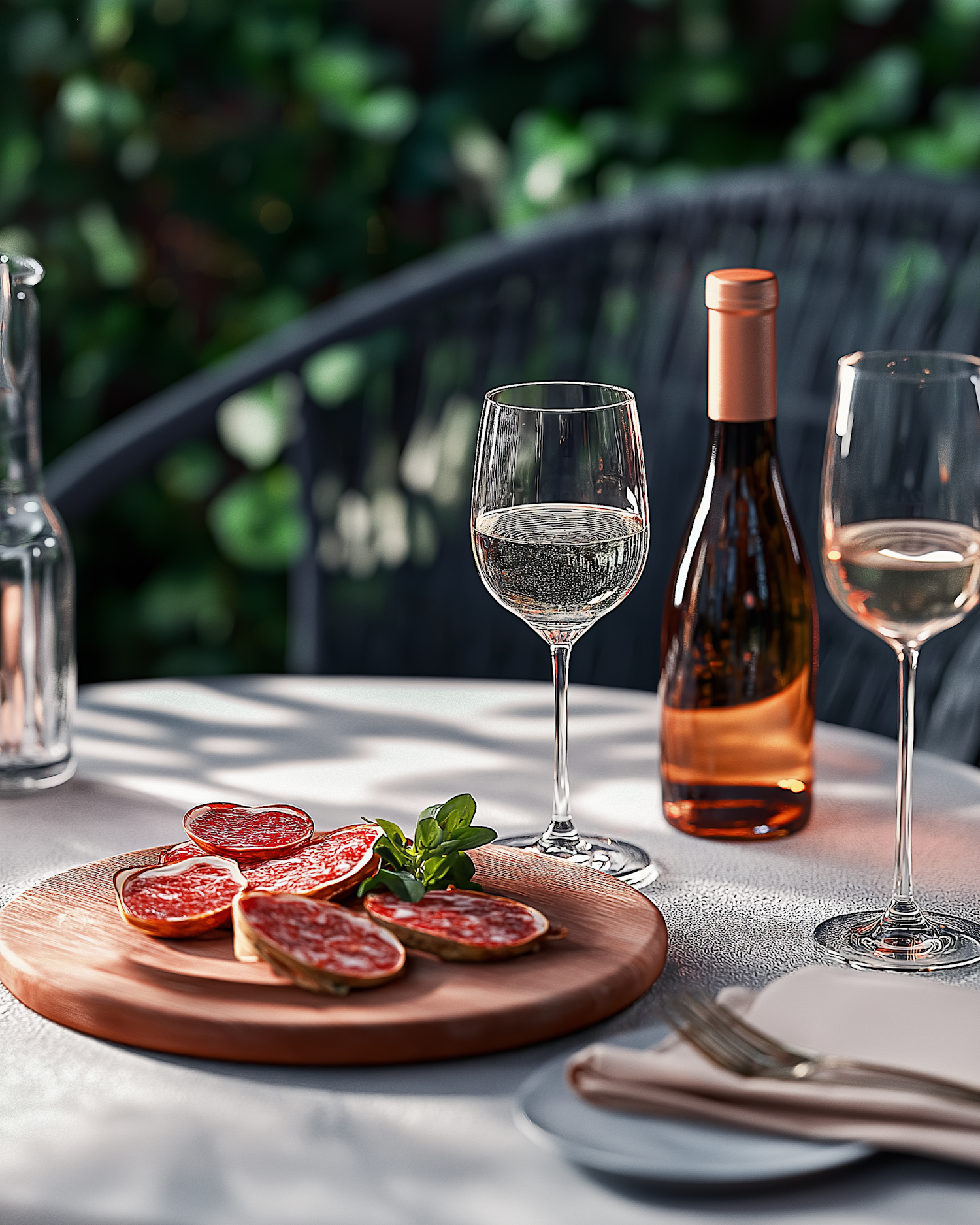 Elegant outdoor table setting with wine, salami, and herbs, surrounded by lush greenery. Perfect for a relaxed, sophisticated meal.