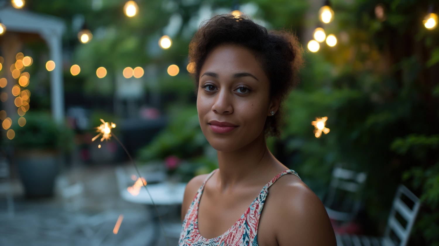 A serene young woman with a sparkler in a garden setting, surrounded by bokeh lights, creating a magical evening ambiance.