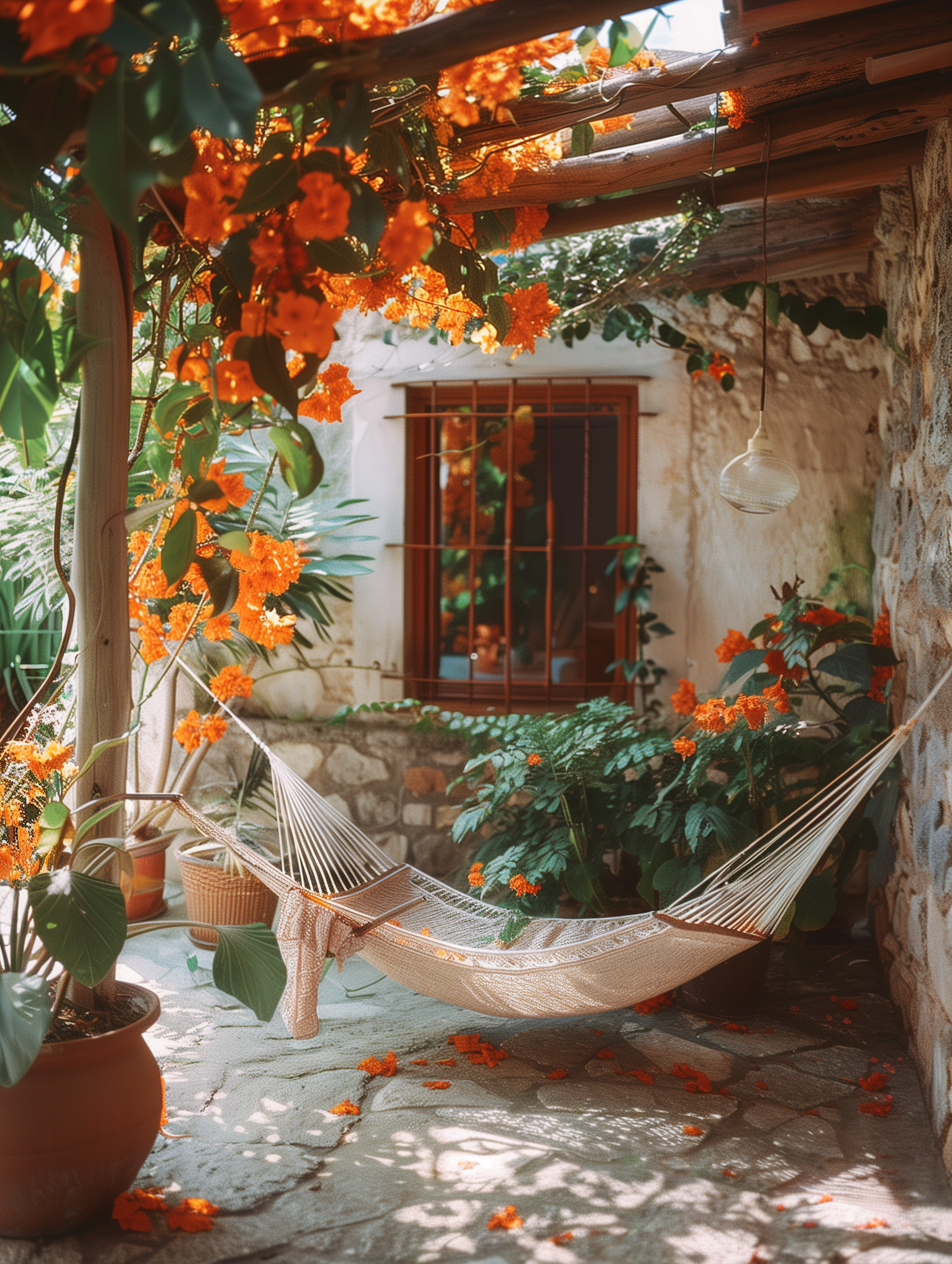 Charming patio with orange flowers, a hammock, and rustic stone walls. Perfect for relaxation and enjoying nature's beauty.