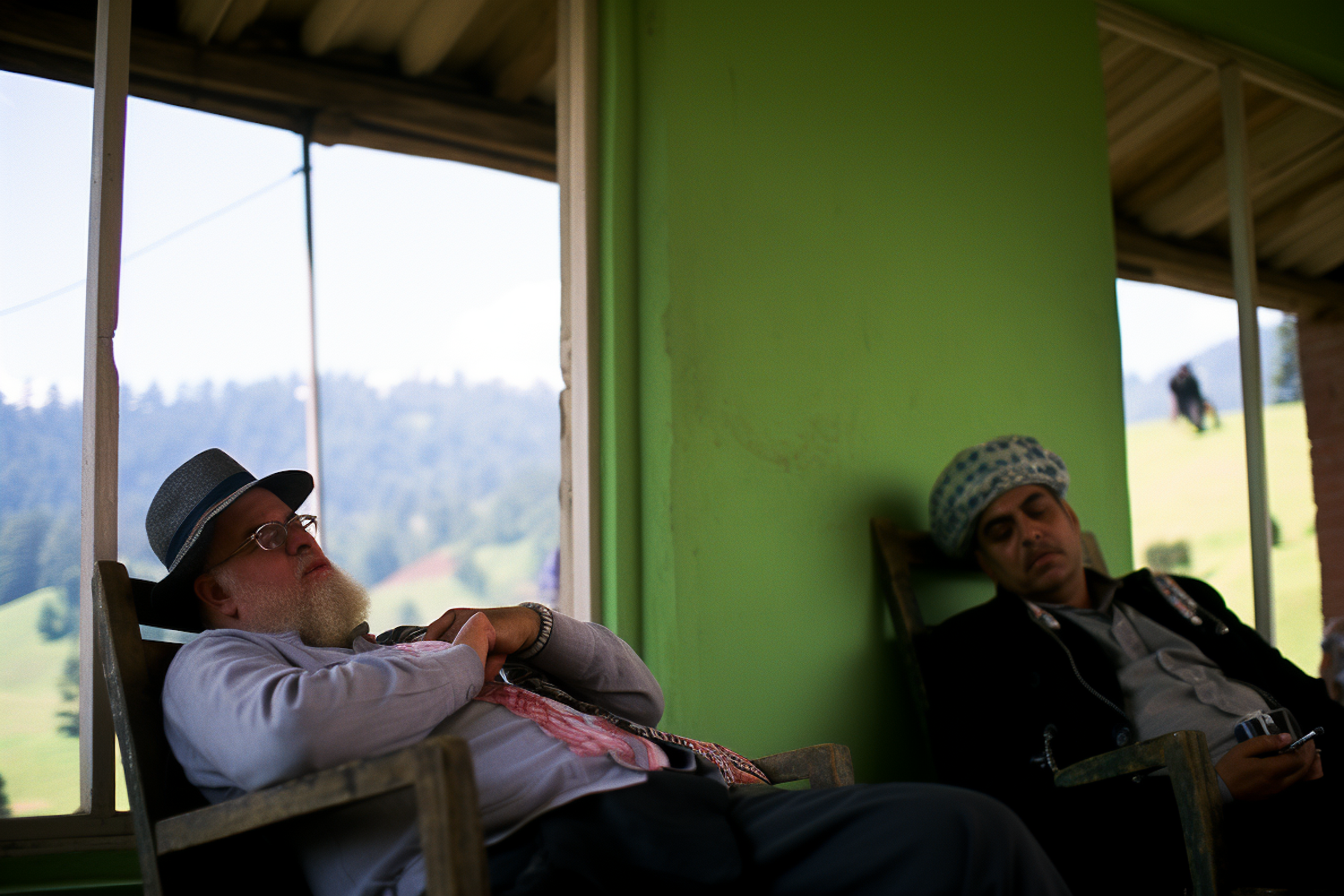 Two men rest in chairs by a green wall, one with a hat and beard, the other with a headscarf, in a serene outdoor setting.