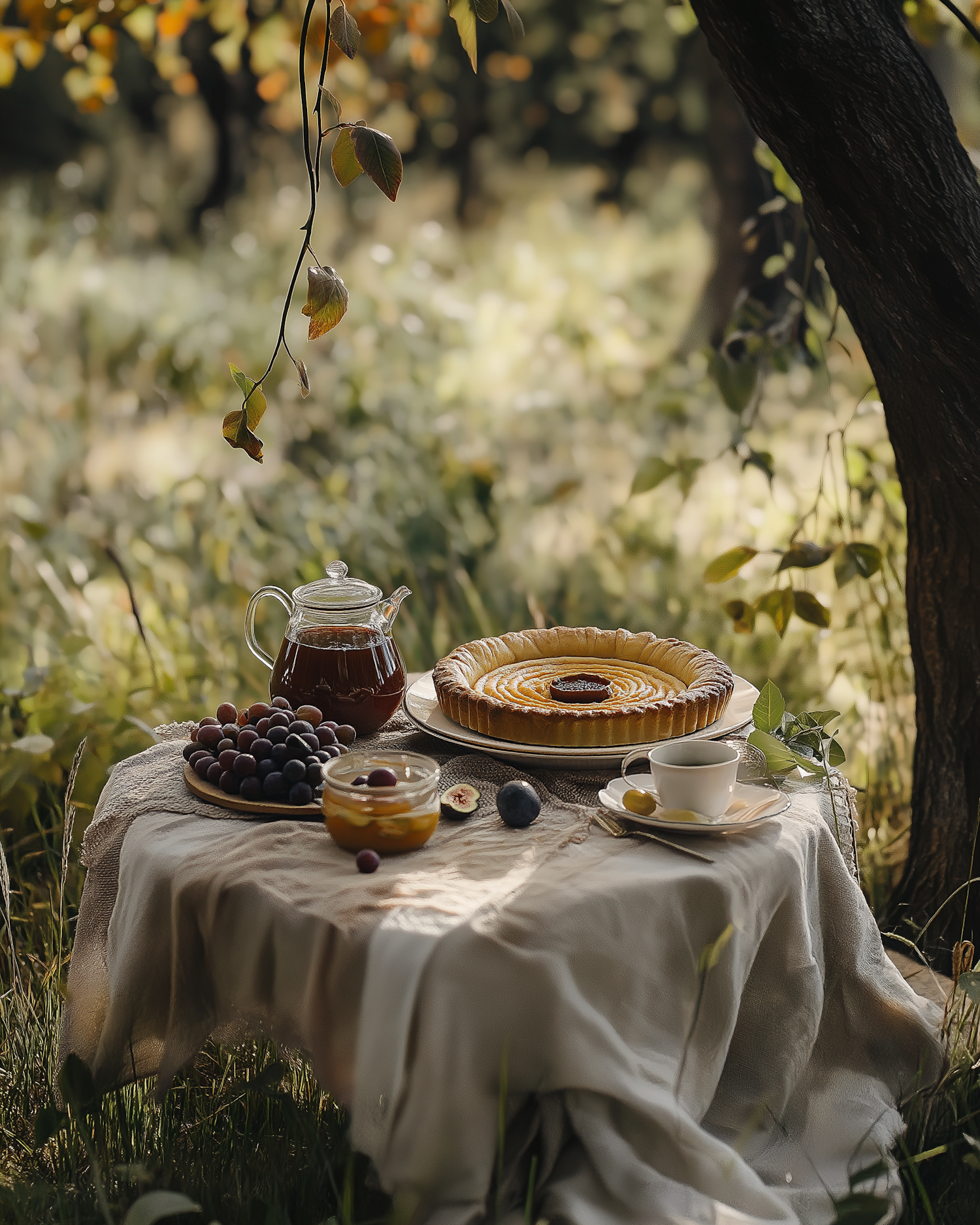 Charming outdoor picnic setup with tea, fruit tart, and grapes under a tree in a sunlit garden.