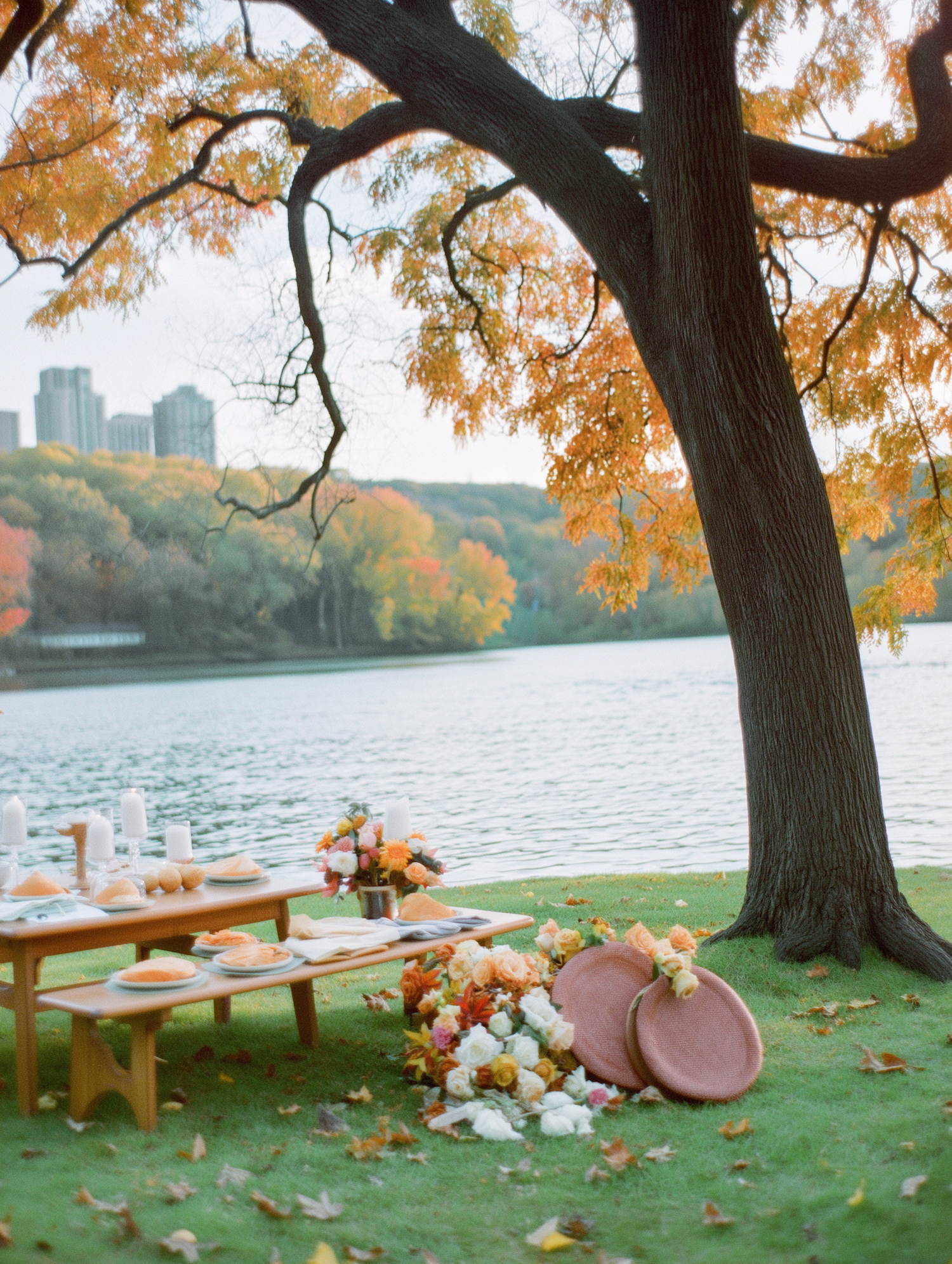 Charming autumn picnic by a lake with a beautifully set table, colorful flowers, and straw hats under a tree.