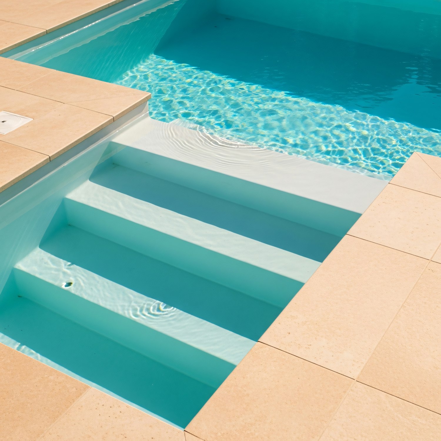 A tranquil pool with submerged steps and shimmering blue water, surrounded by beige tiles, perfect for a relaxing summer day.