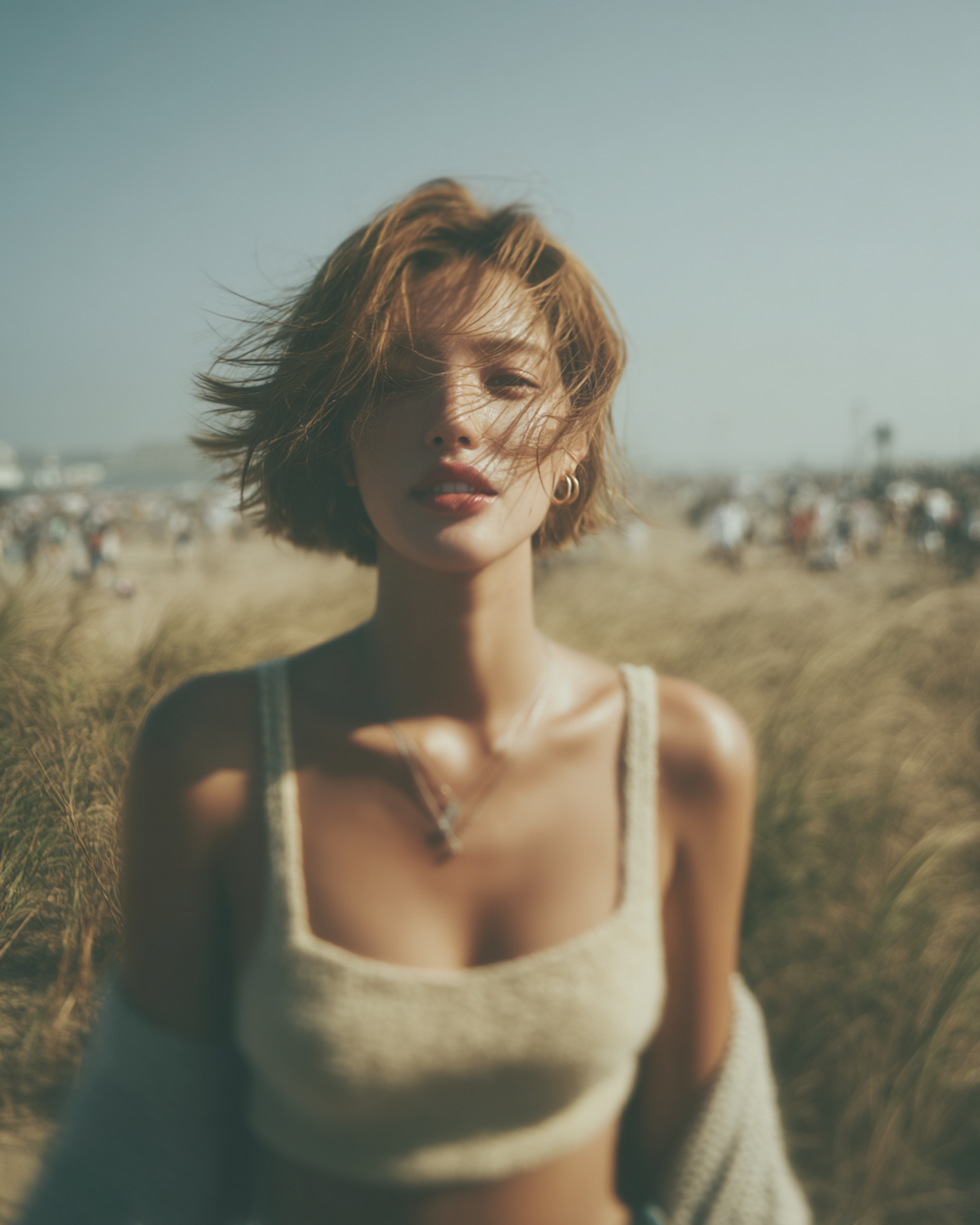 A serene portrait of a woman outdoors, with short hair and a knitted top, set against a blurred natural background.