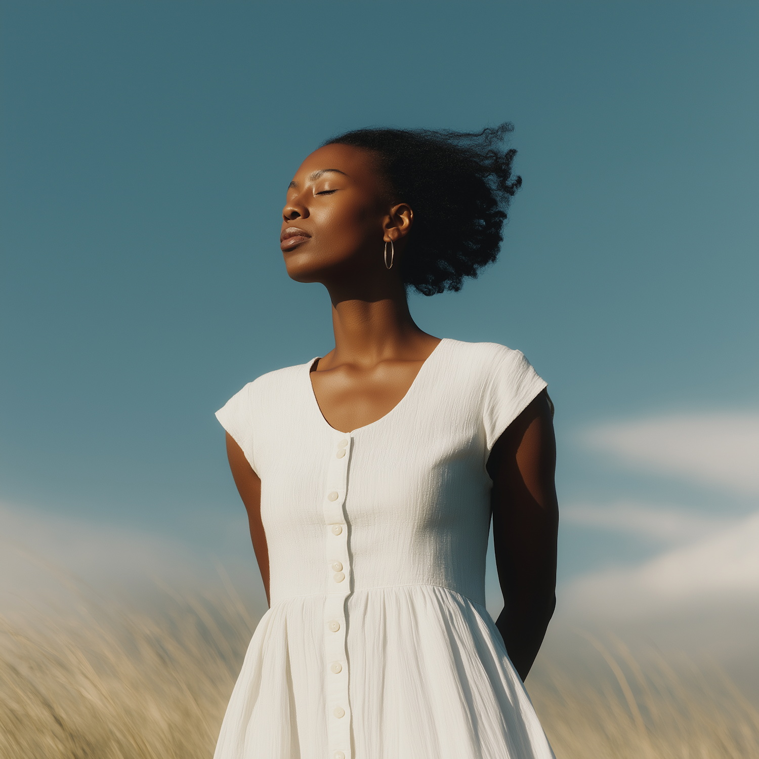 A serene moment of a woman in a white dress enjoying the outdoors under a clear blue sky, with golden grass swaying in the breeze.