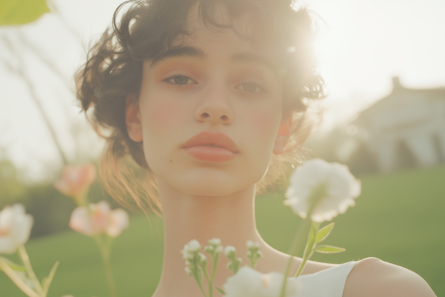 Dreamy portrait of a young woman with curly hair, surrounded by flowers and bathed in warm sunlight in a serene outdoor setting.