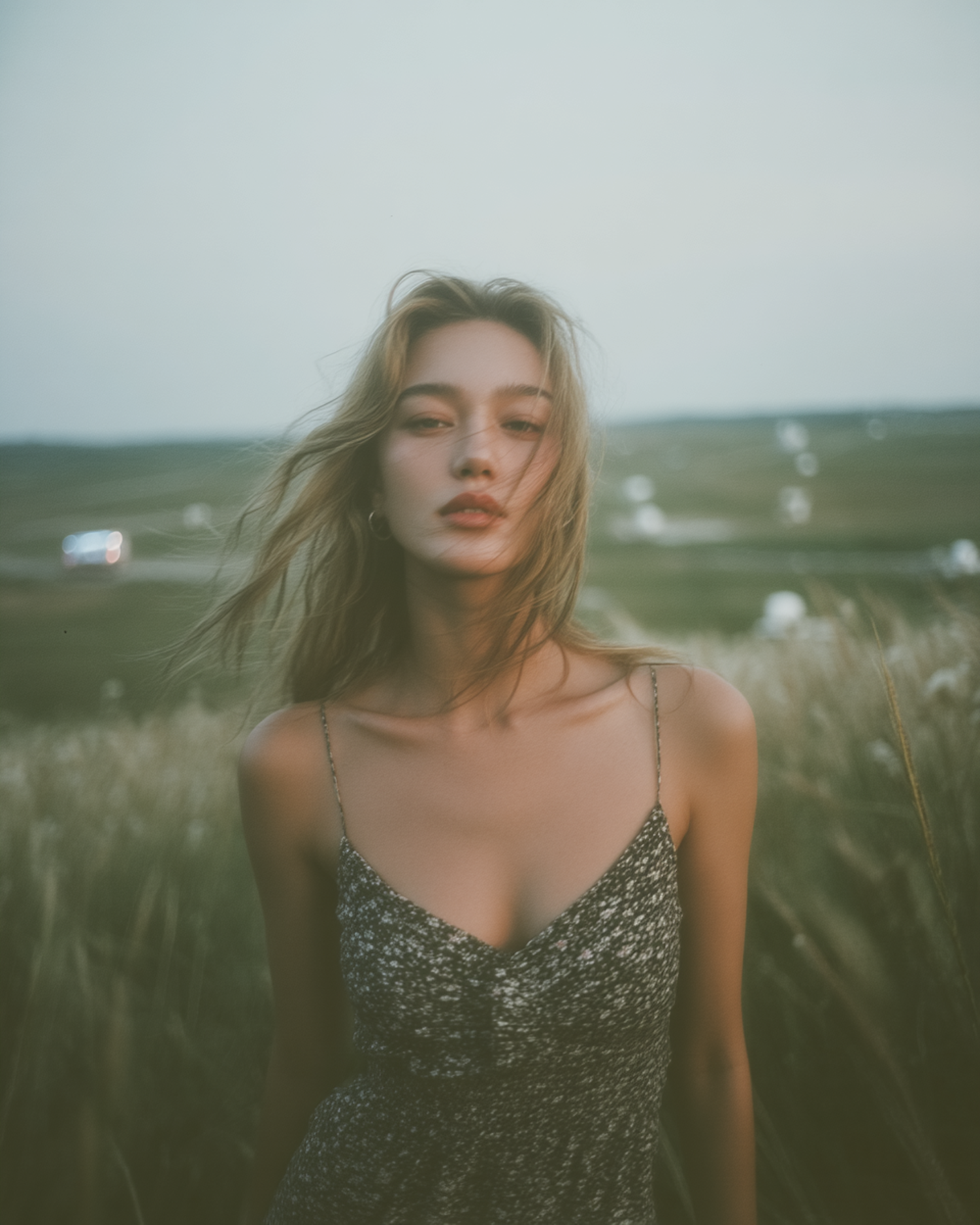 A serene portrait of a young woman in a floral dress, standing in a grassy field with a dreamy, soft-focus background.