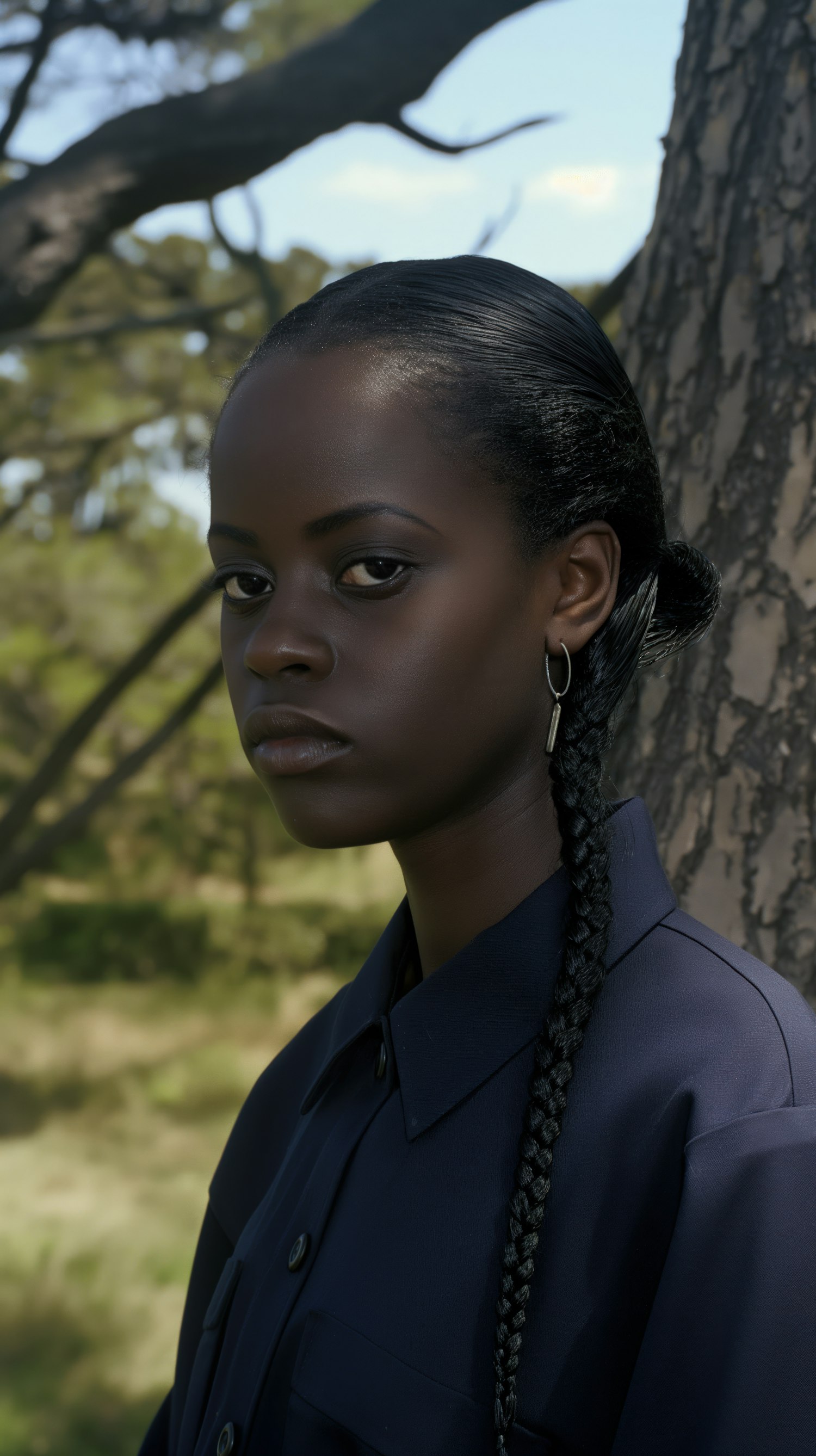 Portrait of a young Black woman with a sleek braid and dark blue shirt, standing outdoors against a tree.