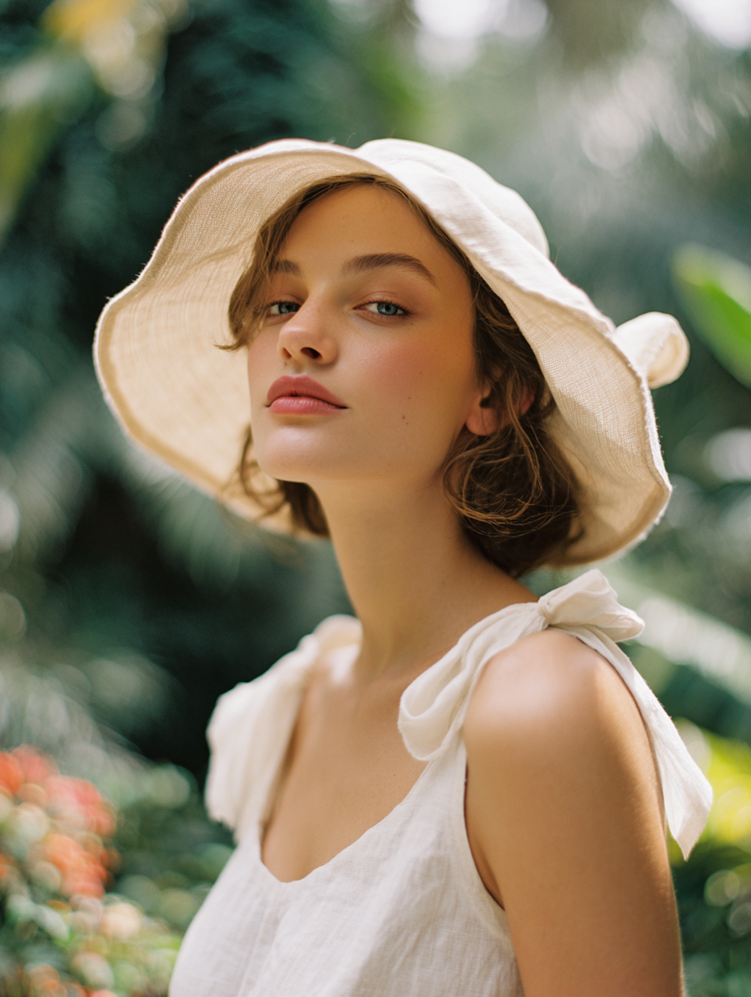 A serene portrait of a woman in a white dress and wide-brimmed hat, set against a lush green background with soft natural lighting.