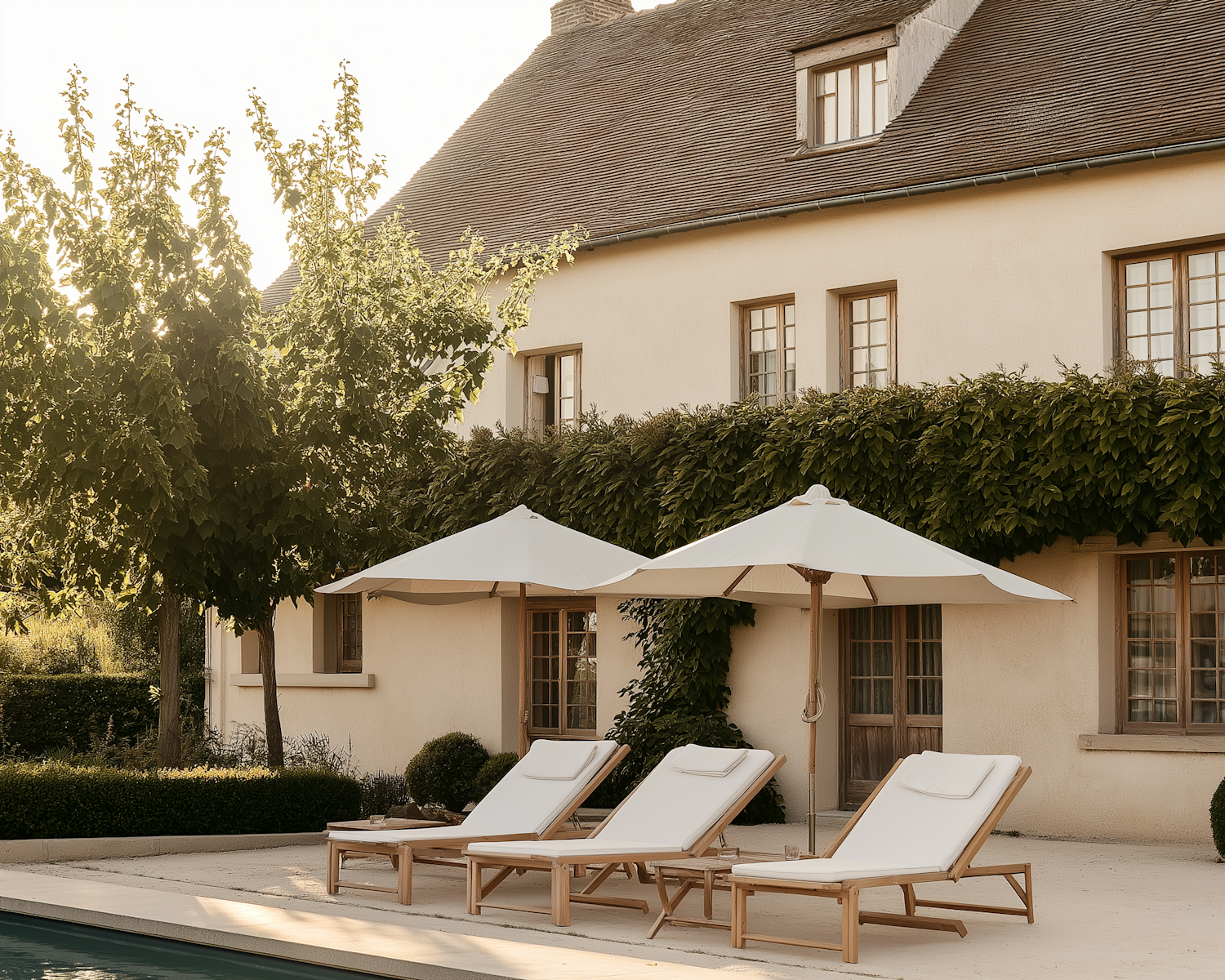 Luxurious poolside with white lounge chairs, umbrellas, and a charming ivy-covered house in warm sunlight.