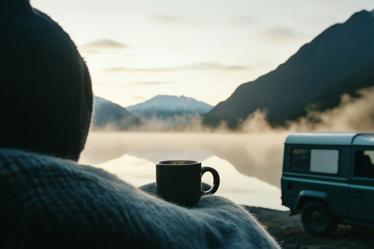 Person enjoying coffee by a misty lake with mountains and a parked off-road vehicle, creating a serene and adventurous atmosphere.