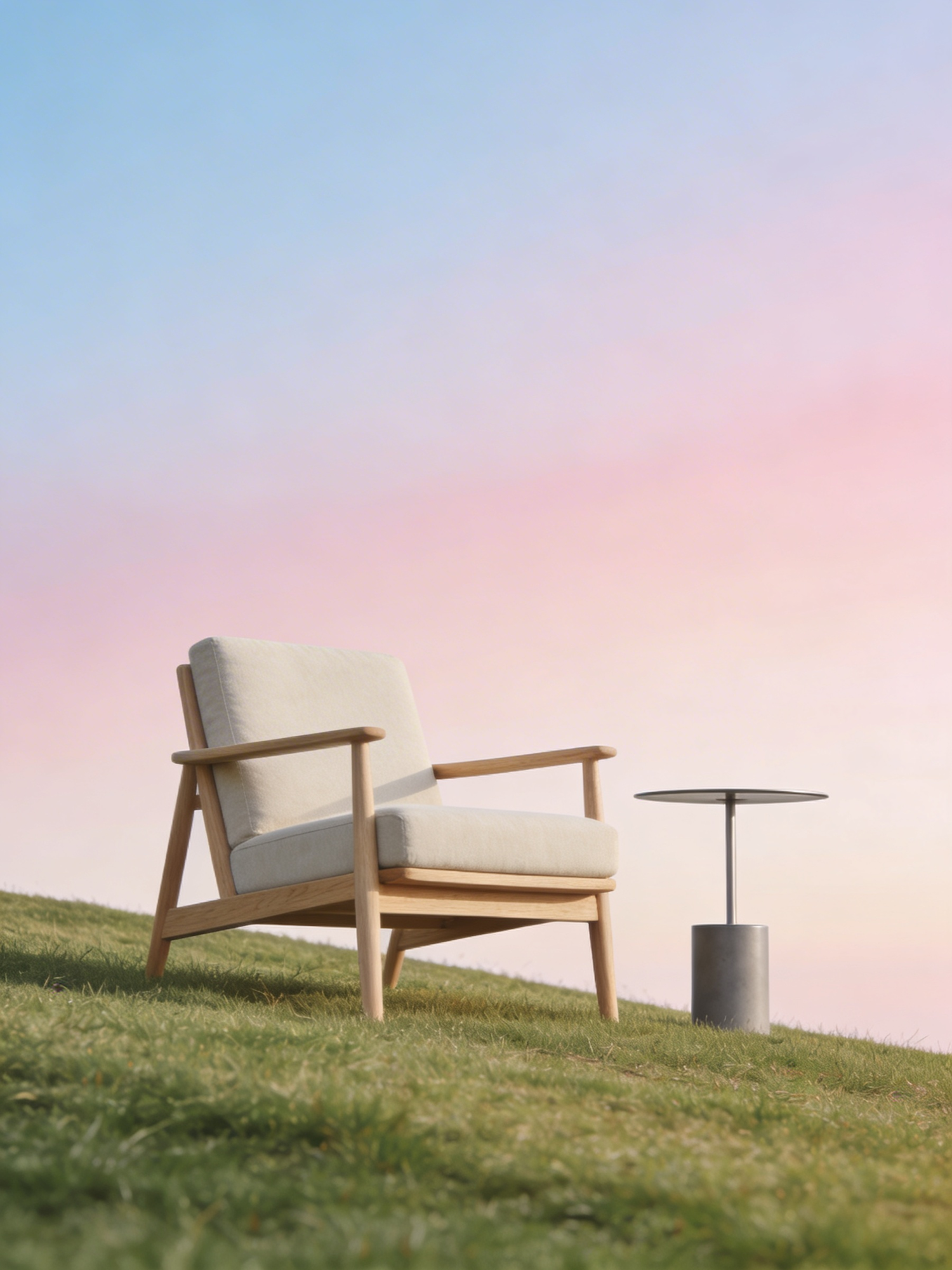 Modern armchair and side table on a grassy slope under a pastel gradient sky, creating a serene and minimalist outdoor setting.