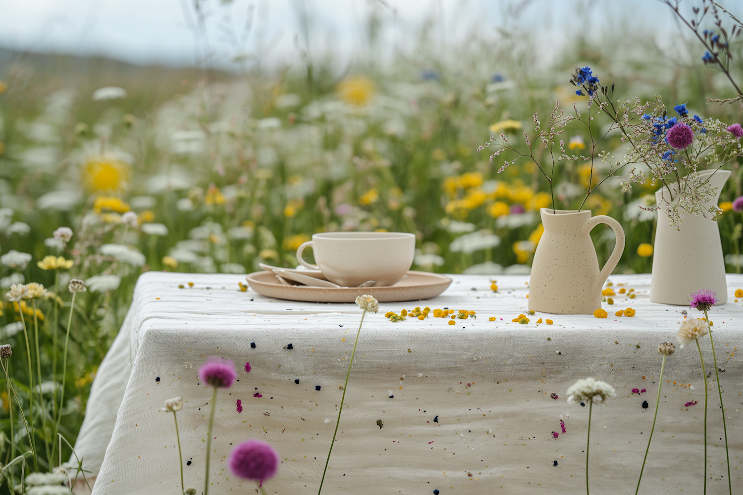 Serene outdoor table setting in a wildflower meadow with ceramic dishes and a jug of wildflowers on a speckled white cloth.