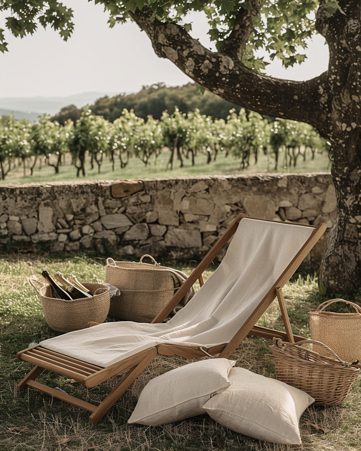 Relaxing outdoor scene with a deck chair, woven baskets, and vineyard backdrop under a shady tree.