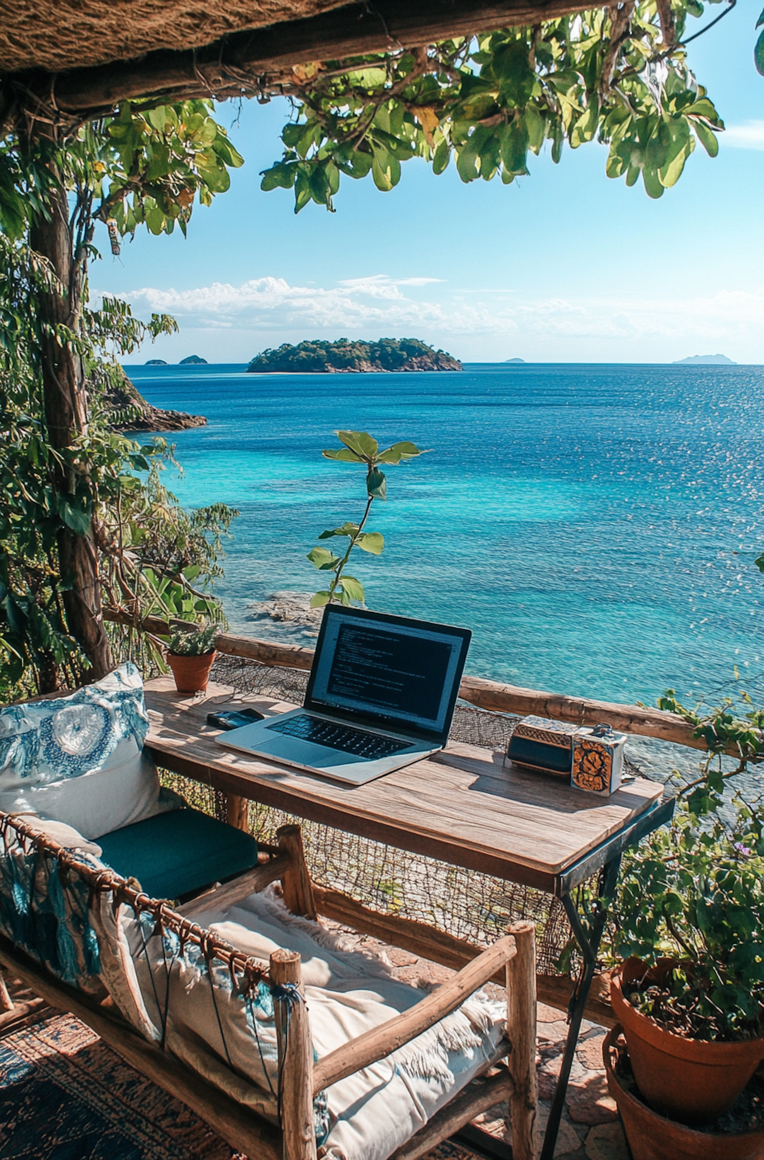 A cozy outdoor workspace with a laptop, lush greenery, and a stunning ocean view featuring a distant island under a clear sky.
