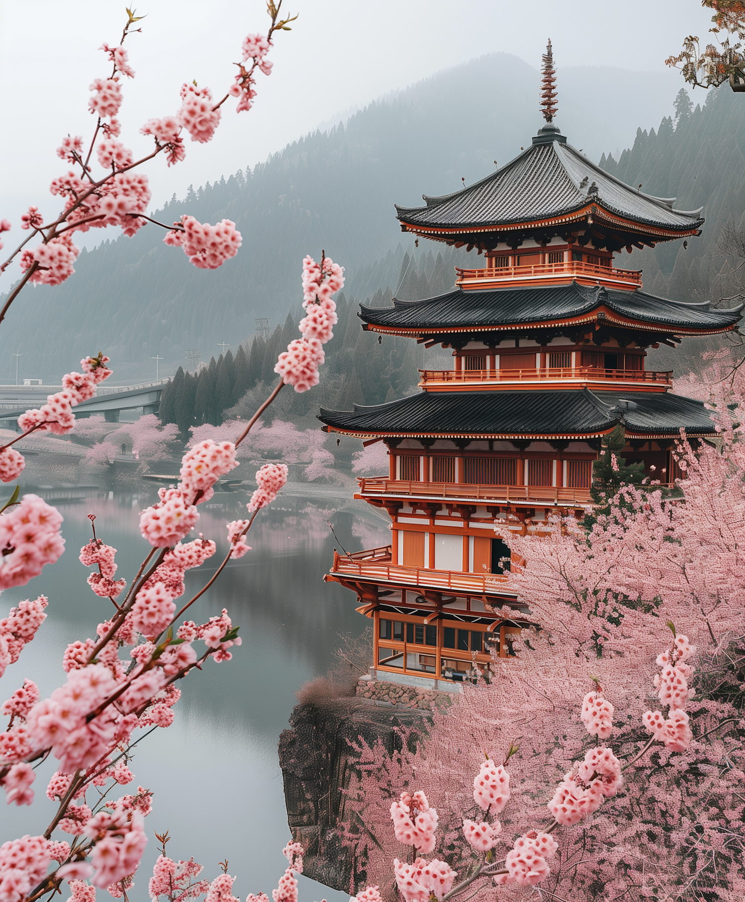 Stunning Japanese pagoda amidst cherry blossoms with misty mountains in the background, creating a serene and picturesque scene.