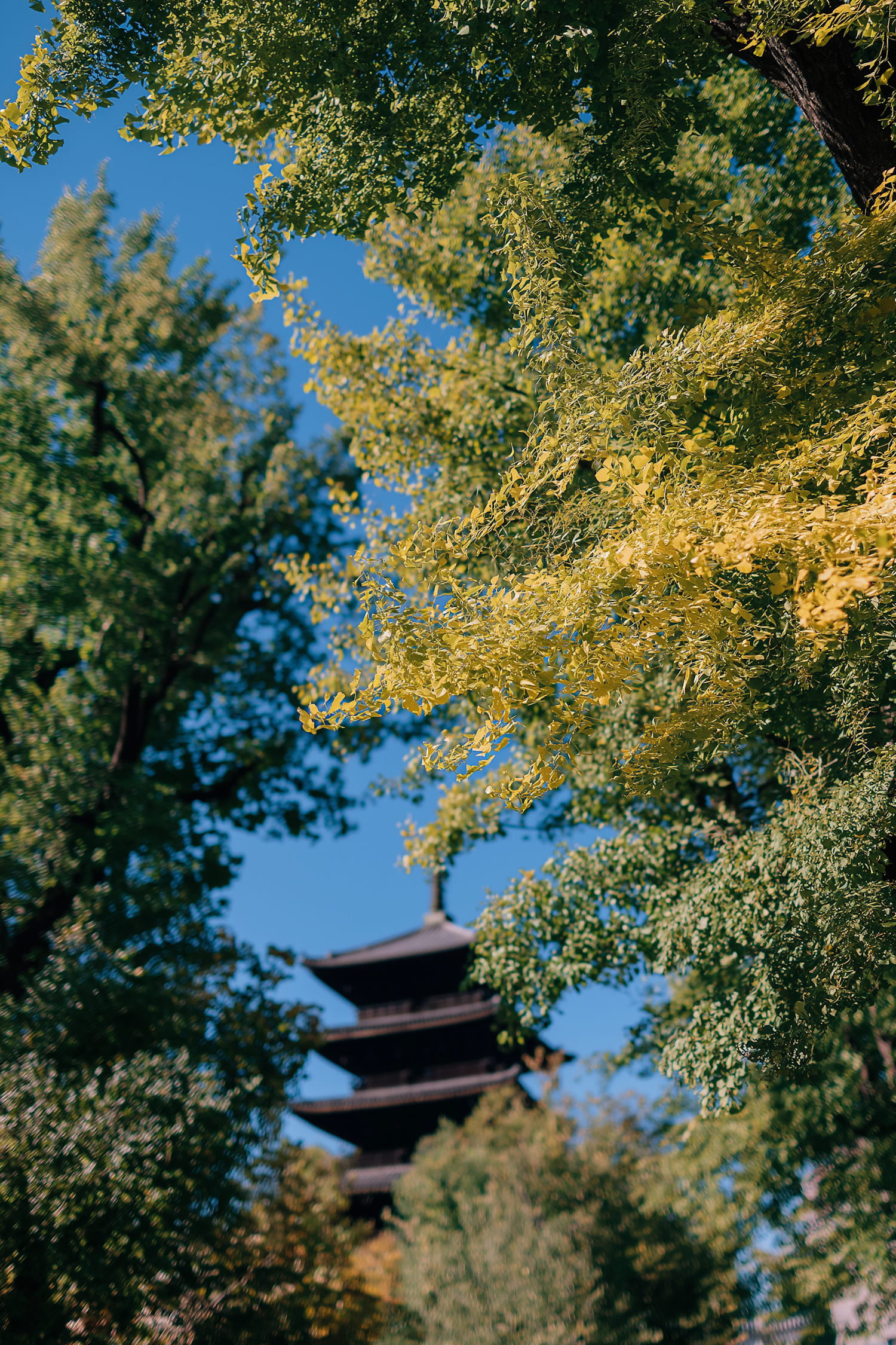 Lush green and yellow leaves frame the view of Yasaka Pagoda, Kyoto against a vivid blue sky, creating a serene, natural scene.