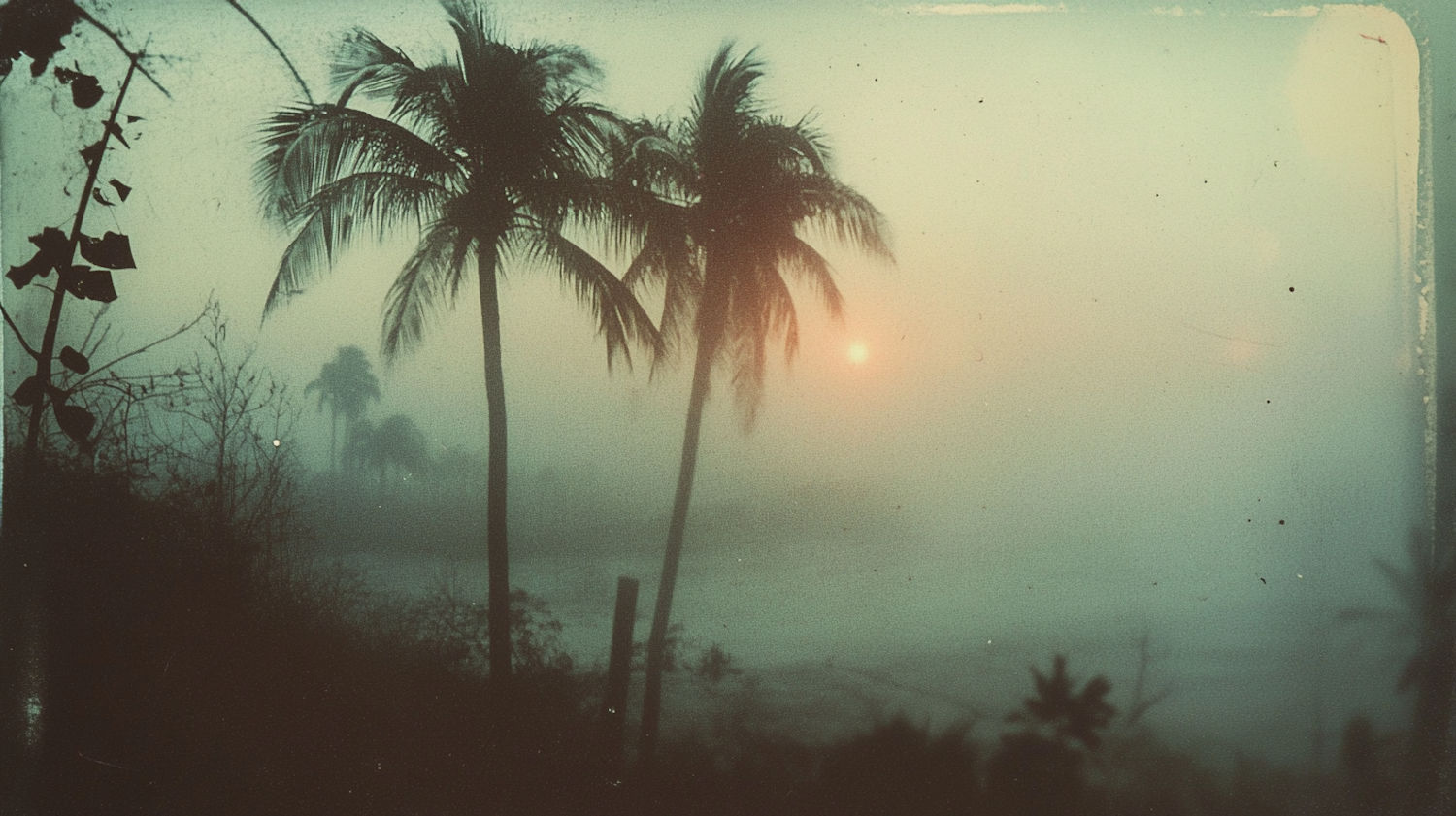 Misty landscape with silhouetted palm trees and a soft, glowing sun. Tranquil and ethereal atmosphere with muted greens and oranges.