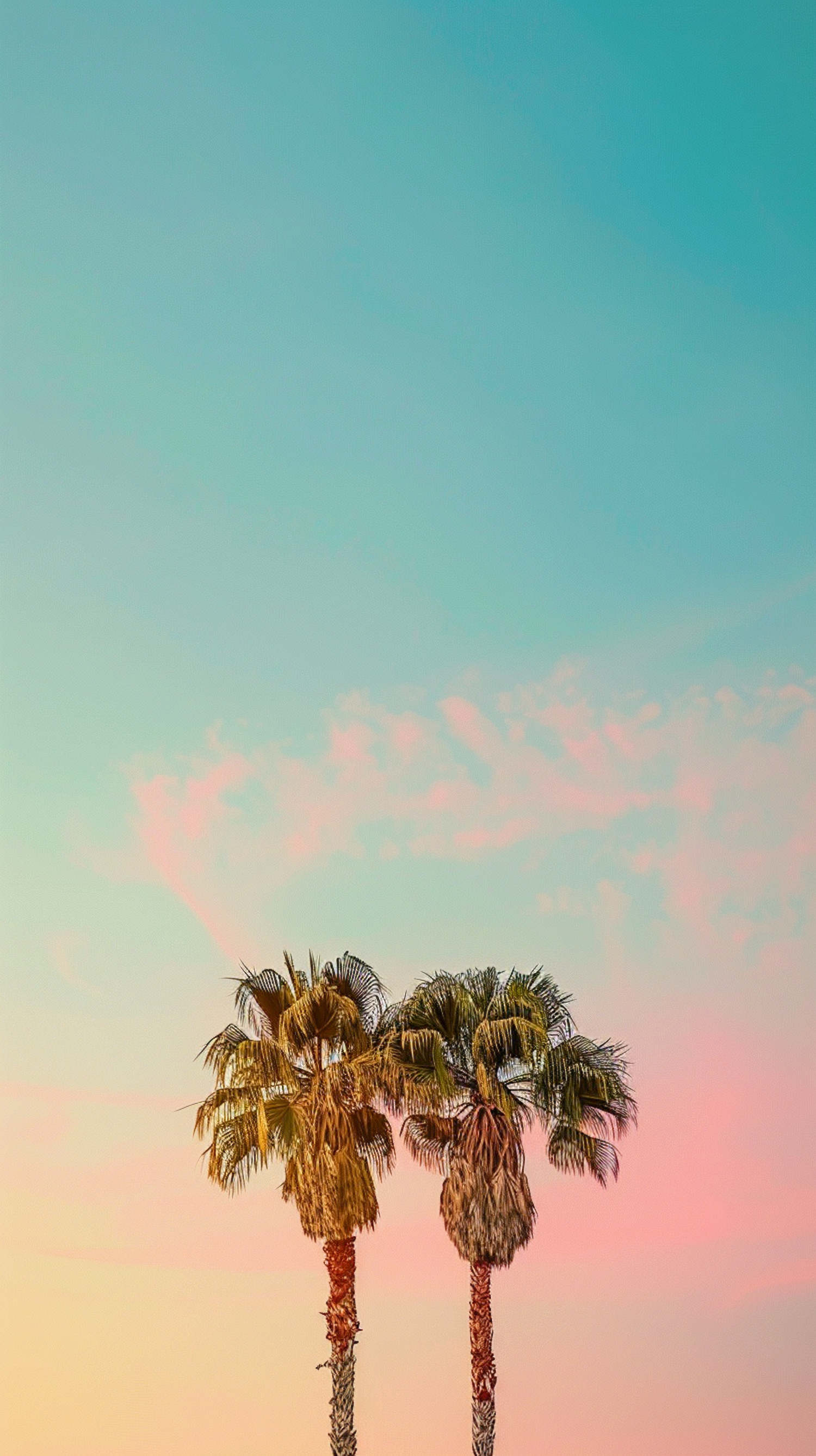 Two palm trees against a pastel sky with pink and blue hues, creating a serene tropical vibe.