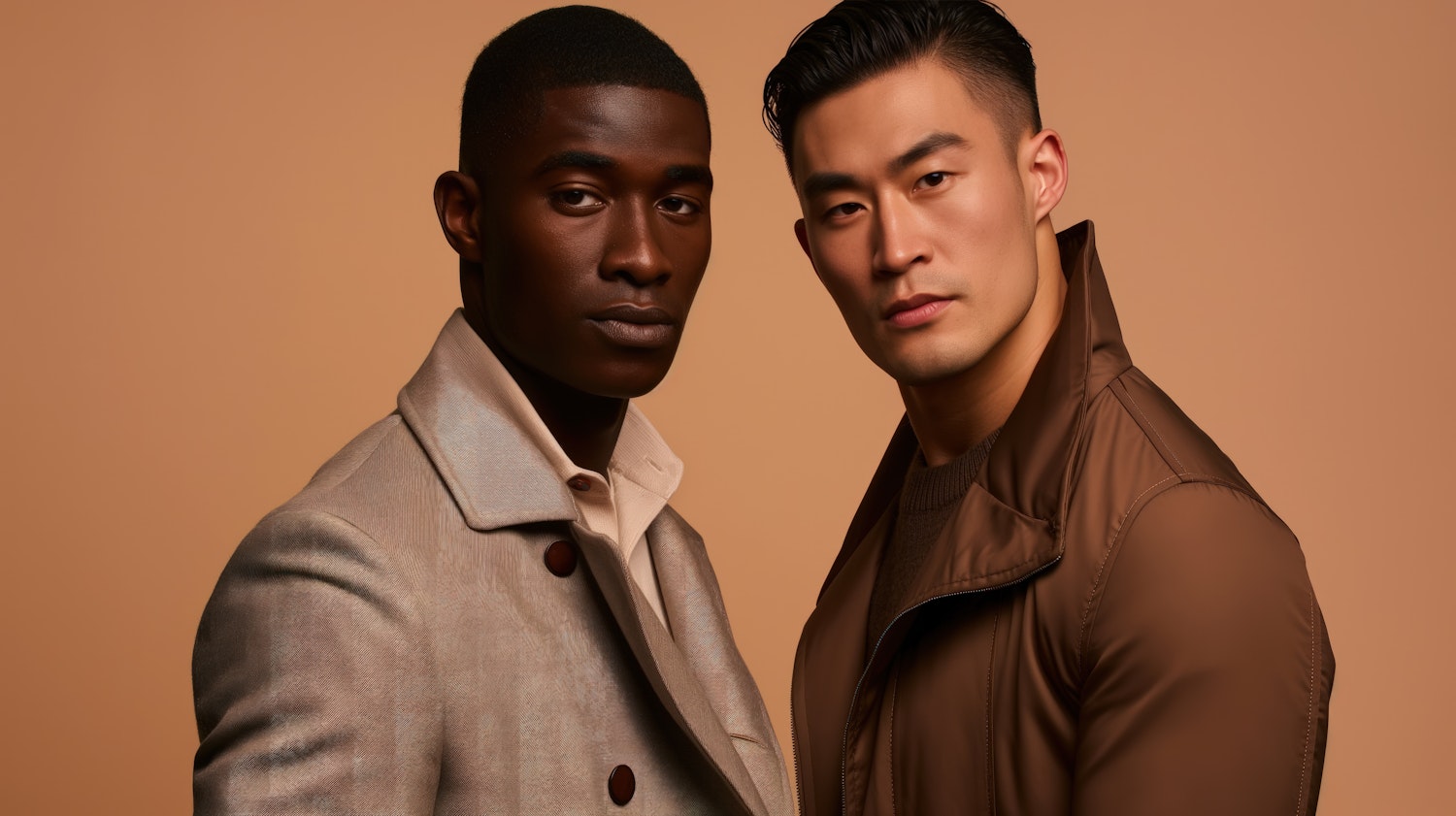 Two stylish men in beige and brown outfits pose confidently against a warm beige background, showcasing modern fashion and elegance.