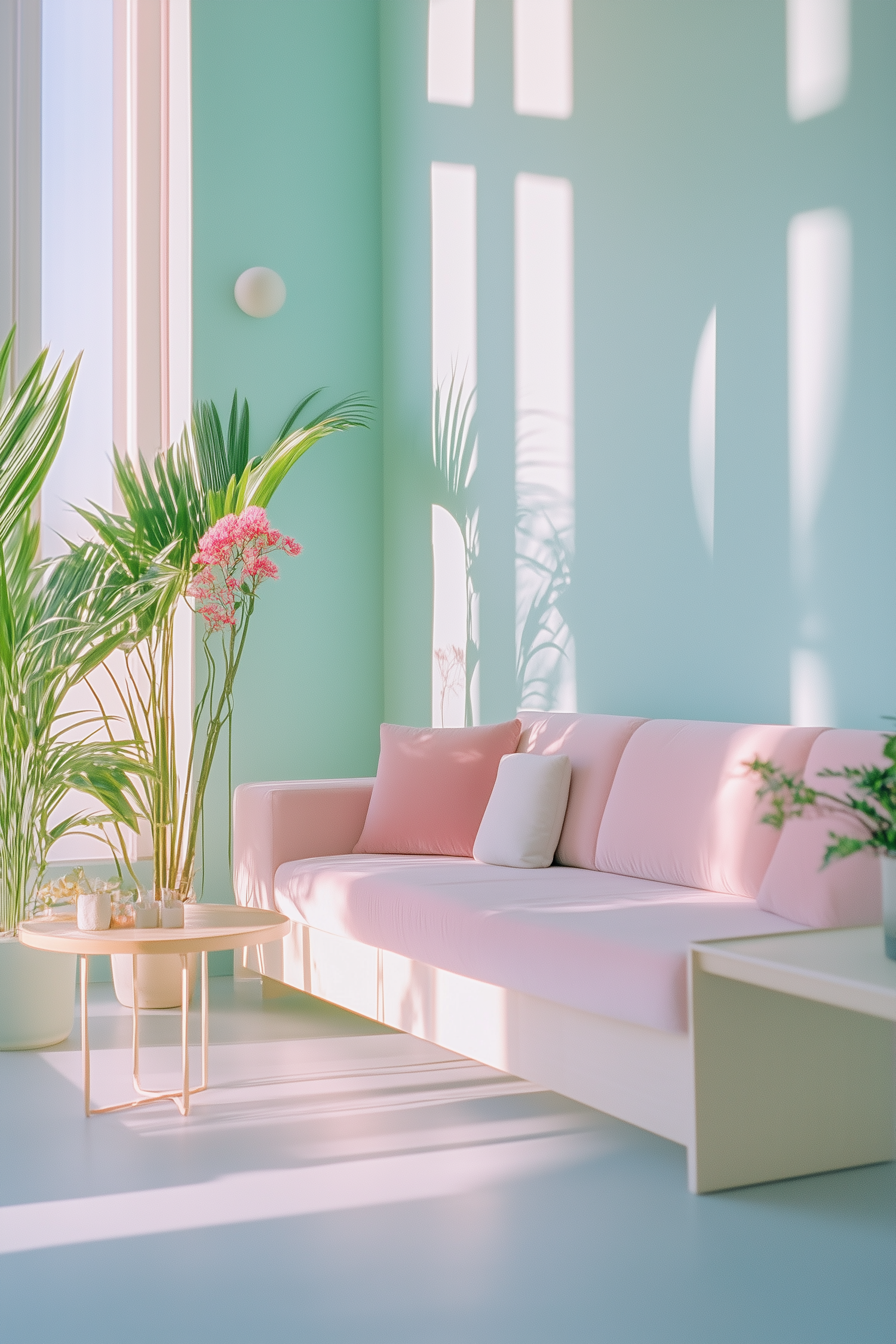 Chic living room with mint green walls, pastel pink sofa, and lush plants. Sunlight creates a serene, inviting atmosphere.