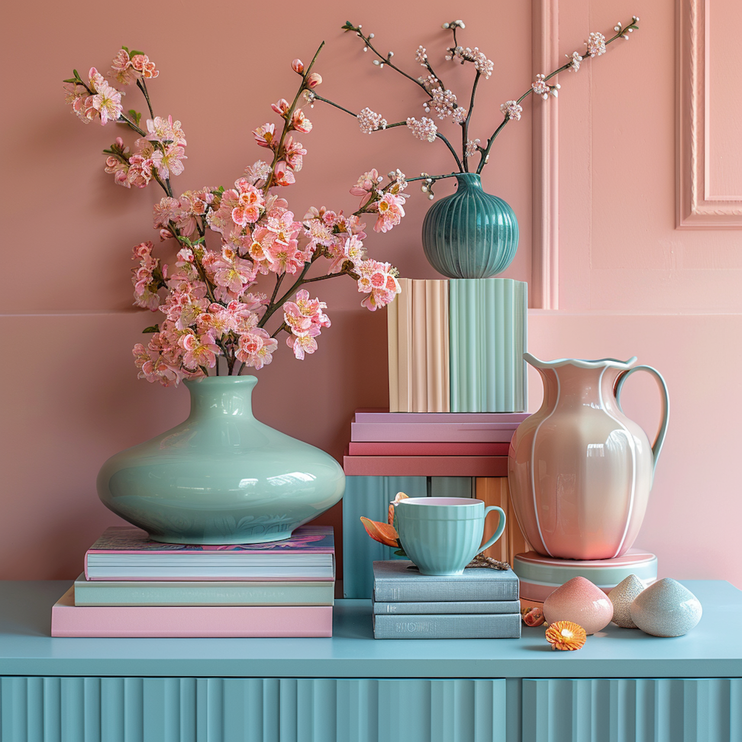 Elegant pastel still life with vases, cherry blossoms, and books in a serene setting. Perfect for home decor inspiration.