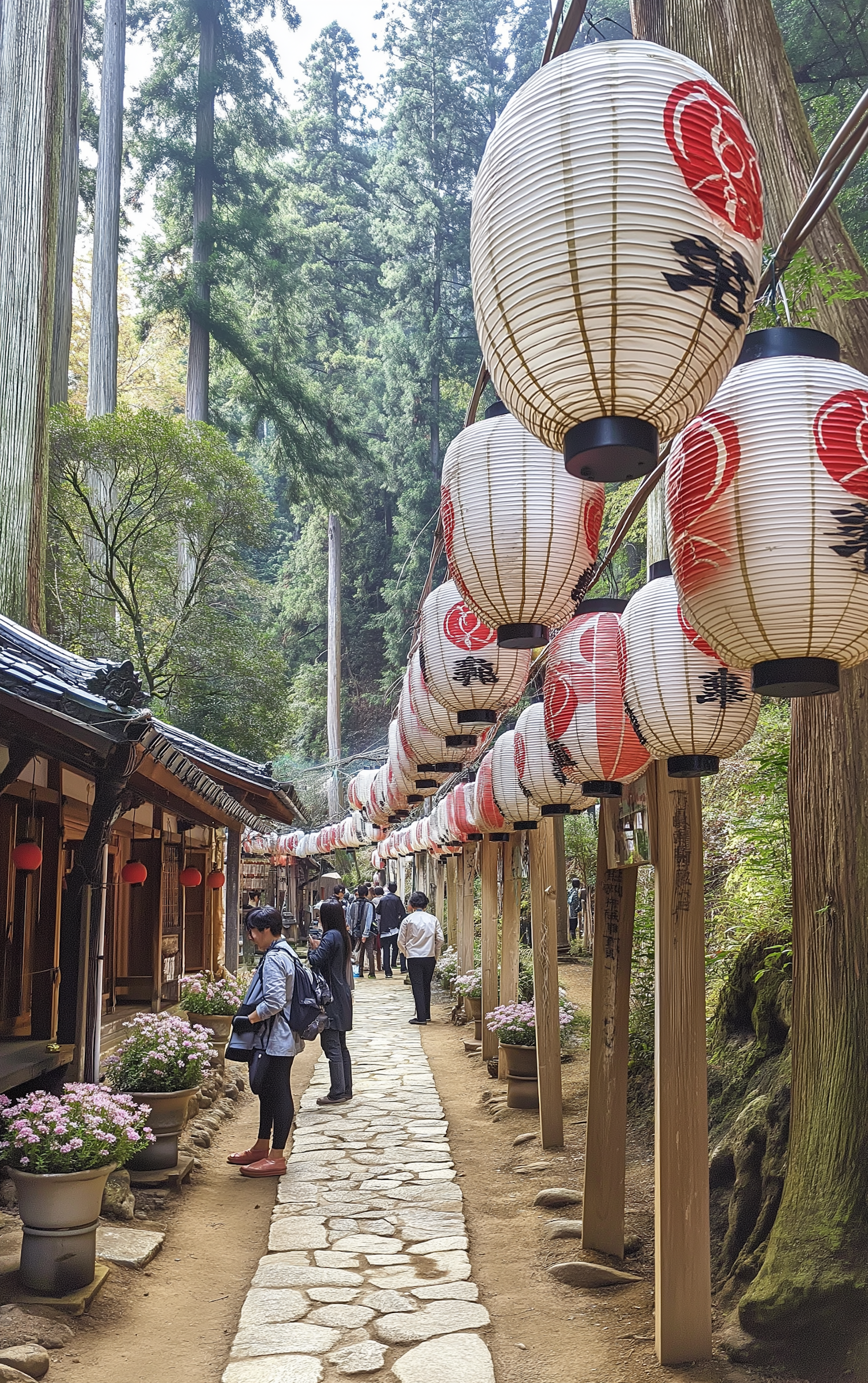 A tranquil Japanese pathway adorned with paper lanterns and surrounded by lush greenery, inviting exploration and reflection.