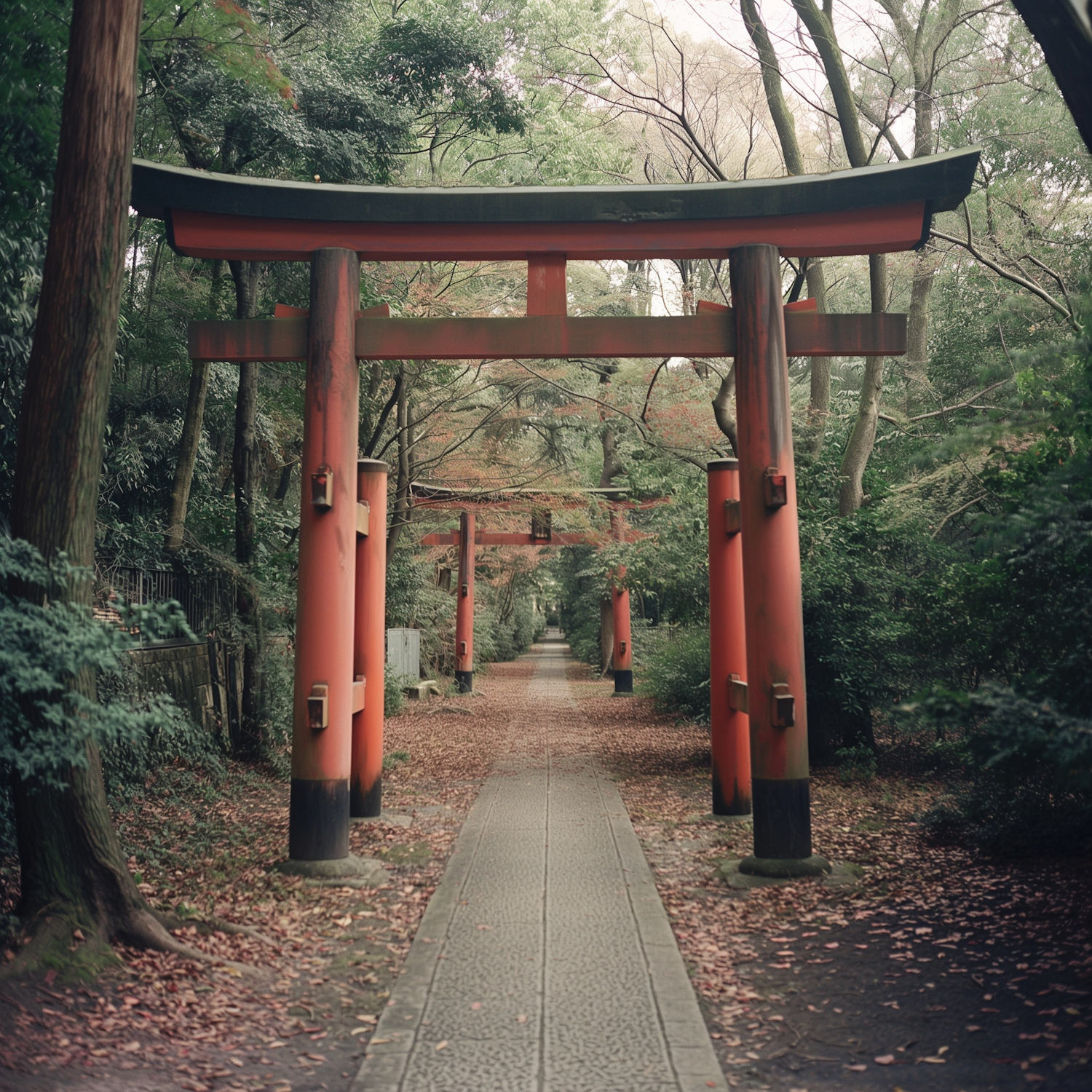 Serene pathway with red torii gates and lush greenery, creating a tranquil and inviting atmosphere.
