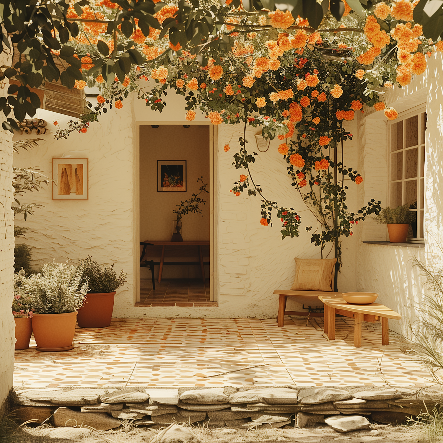 Charming patio with orange flowers, rustic bench, and tiled floor. Cozy entrance with potted plants and warm, textured walls.