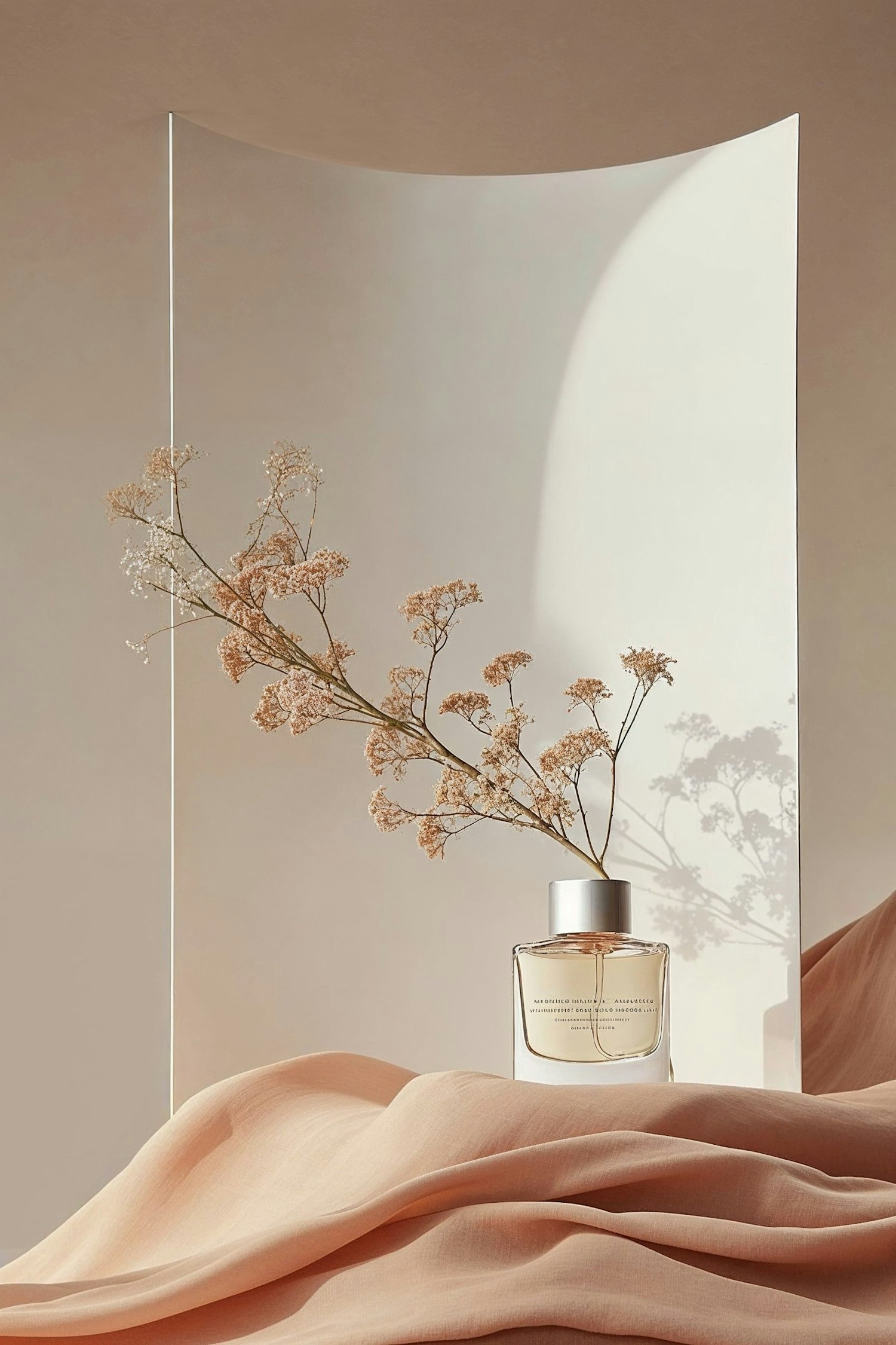 Elegant perfume bottle with dried flowers on peach fabric, casting shadows on a translucent backdrop. Minimalist and sophisticated design.