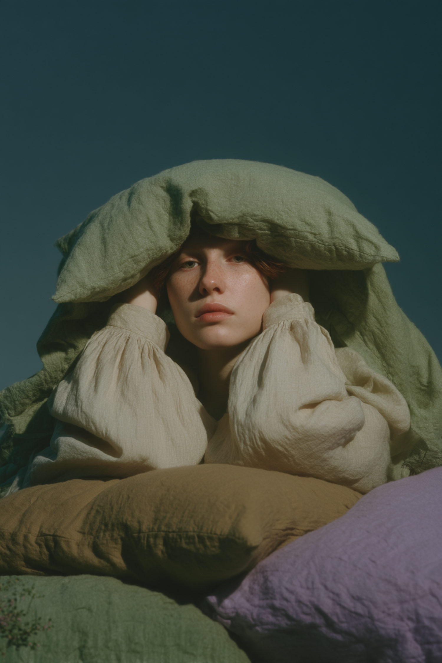 A serene scene with a person surrounded by pastel-toned pillows under a tranquil backdrop, creating a peaceful composition.