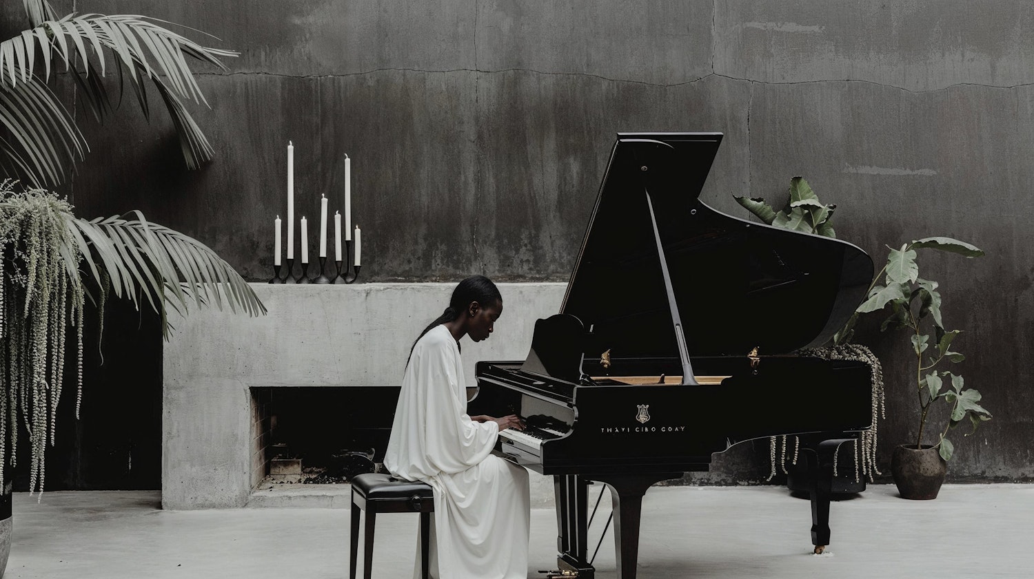 Elegant scene of a woman in a white dress playing a grand piano, surrounded by candles and lush plants in a minimalist setting.