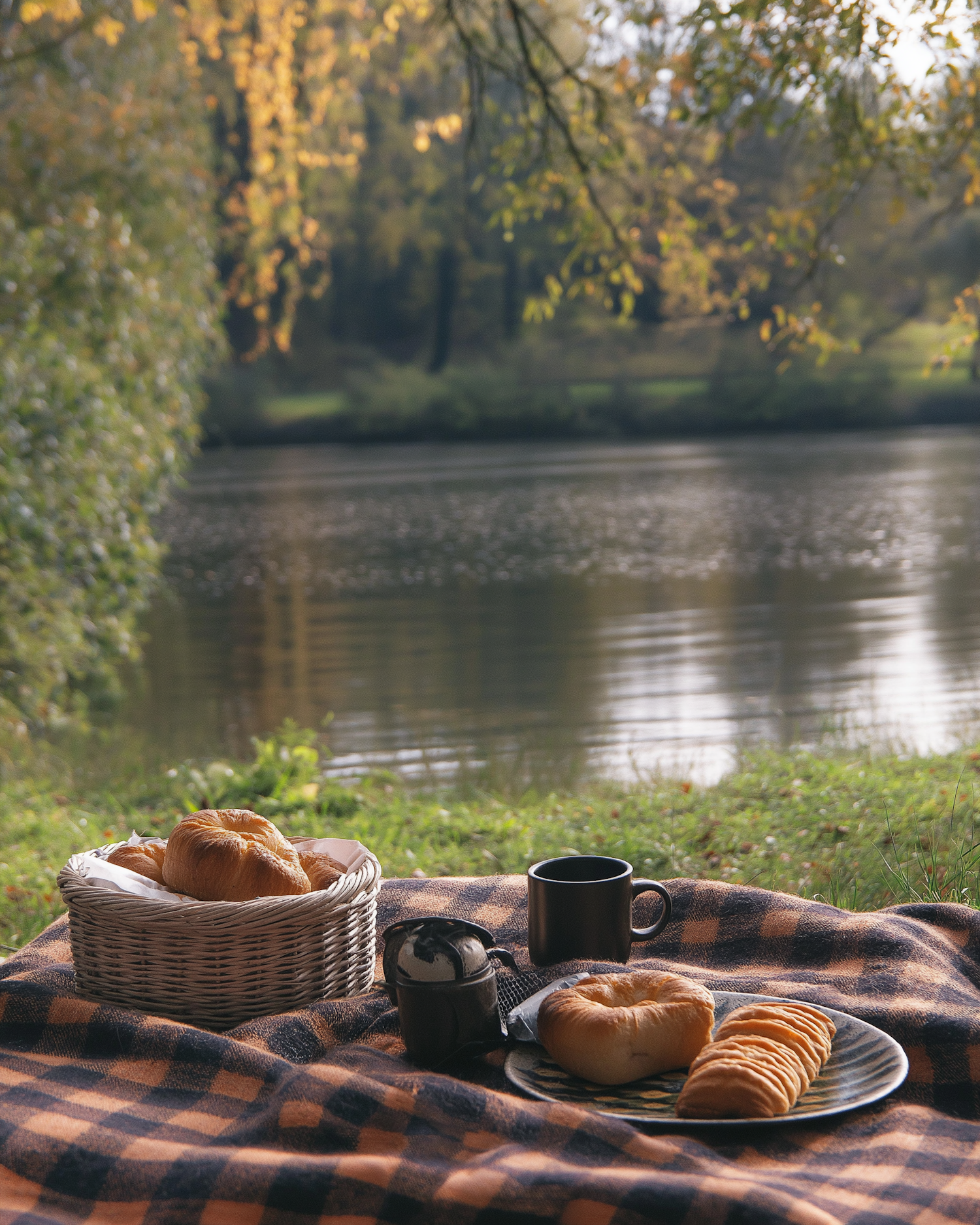 Cozy picnic by a lake with croissants, mugs, and a checkered blanket. Serene autumn setting with lush greenery and calm waters.