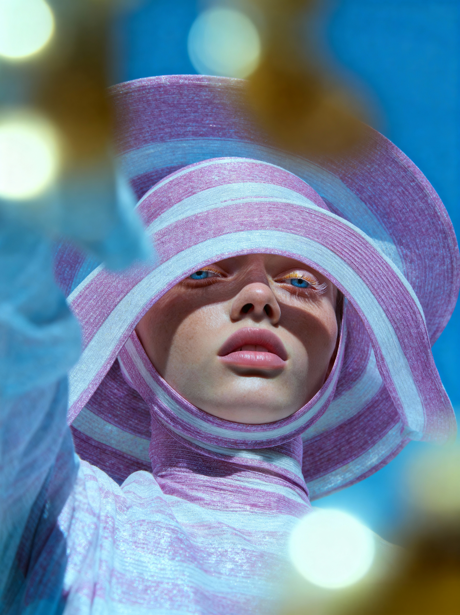 A striking close-up of a person in pastel pink and white attire against a vibrant blue background, with dramatic lighting and shadows.