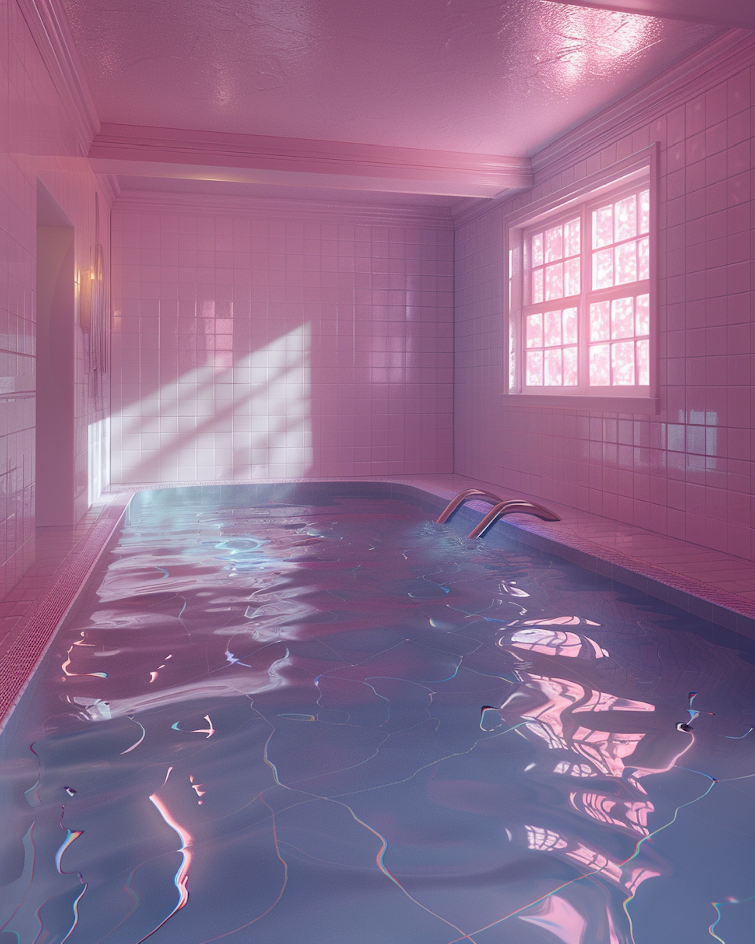 A tranquil indoor pool with pink tiles and soft lighting, creating a serene and dreamy atmosphere.