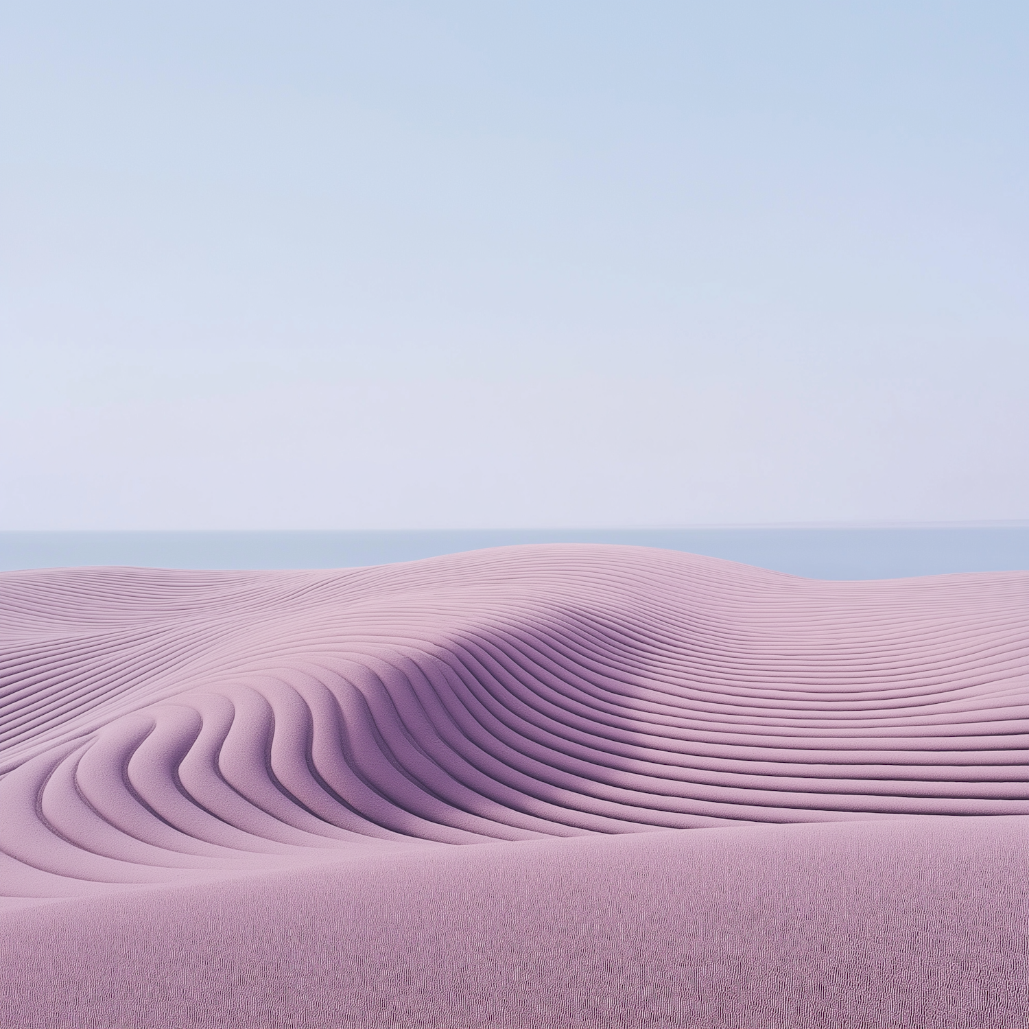 Lavender sand dunes under a pale blue sky create a serene and minimalist landscape, highlighting natural beauty and tranquility.