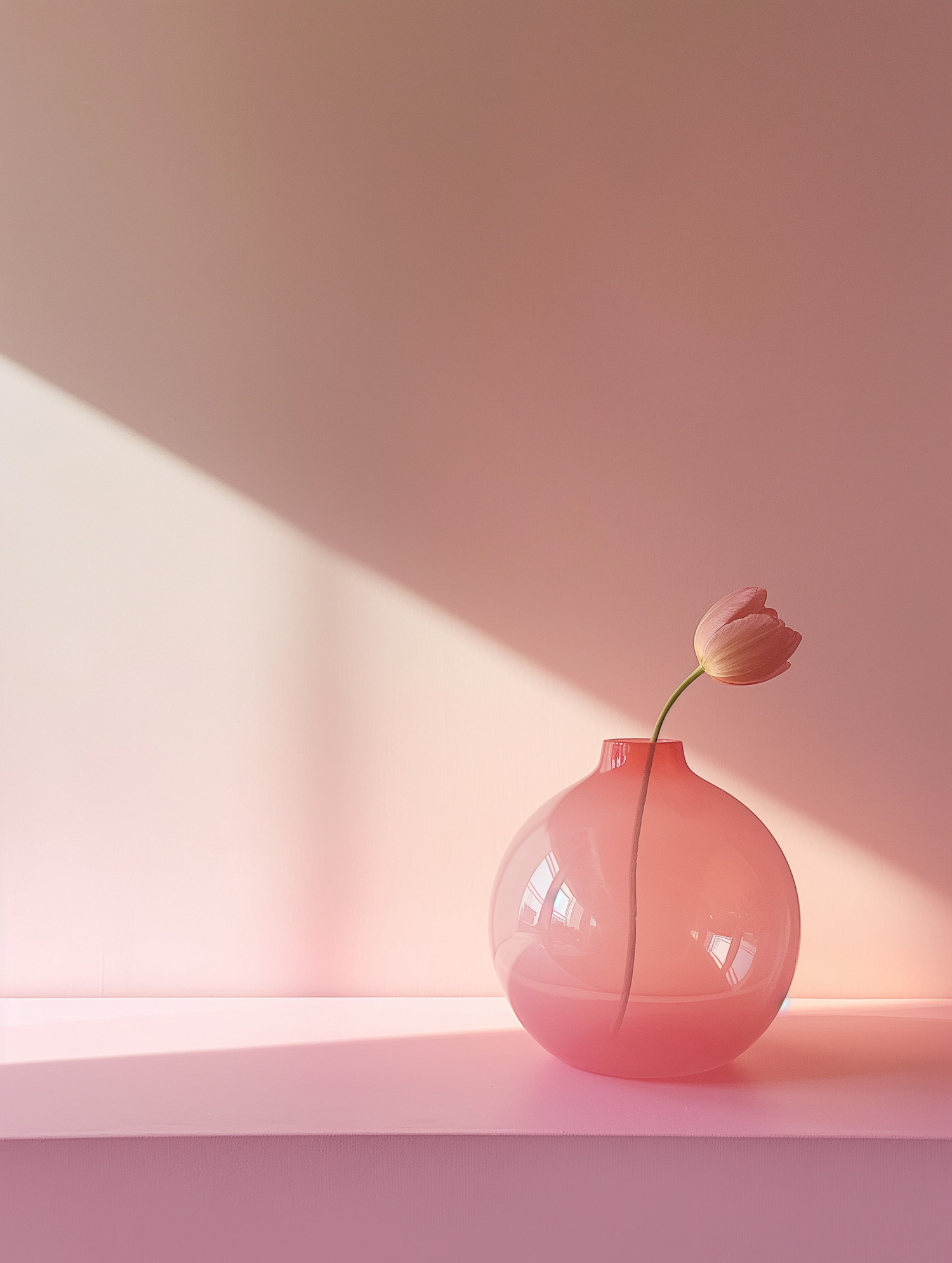 Minimalist pink tulip in a round vase against a soft pink background, creating a serene and elegant composition.